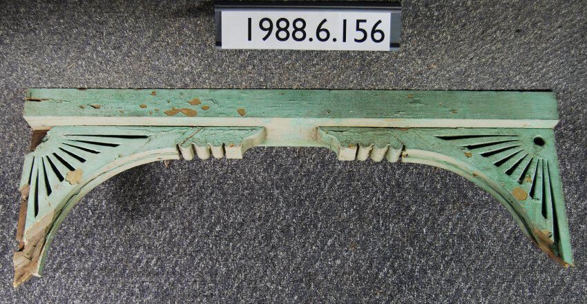 Wood bracket. Dual brackets mounted on horizontal beam. Sunburst motif. Painted green. Inscriptions or Markings: Manufacturer: Place of Manufacturer: Design motif: Style: Finish: Painted