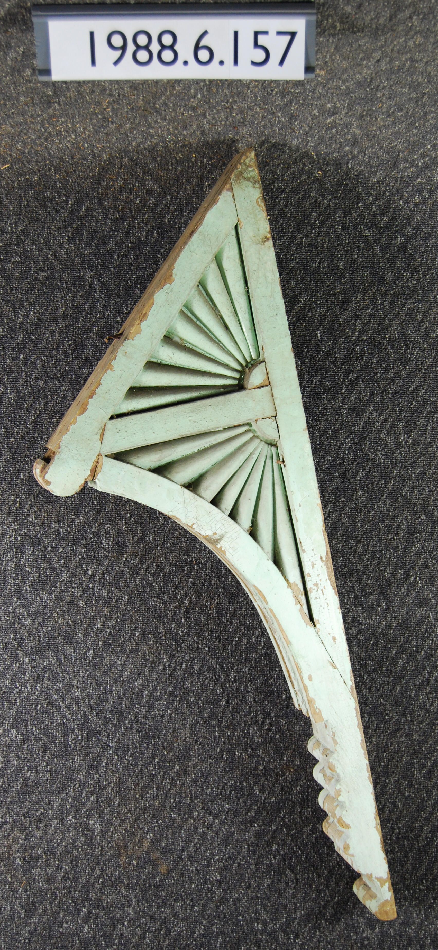 Wood bracket. Angular top. sunburst motif at sides. Painted green. Inscriptions or Markings: Manufacturer: Place of Manufacturer: Design motif: Style: Finish: Painted