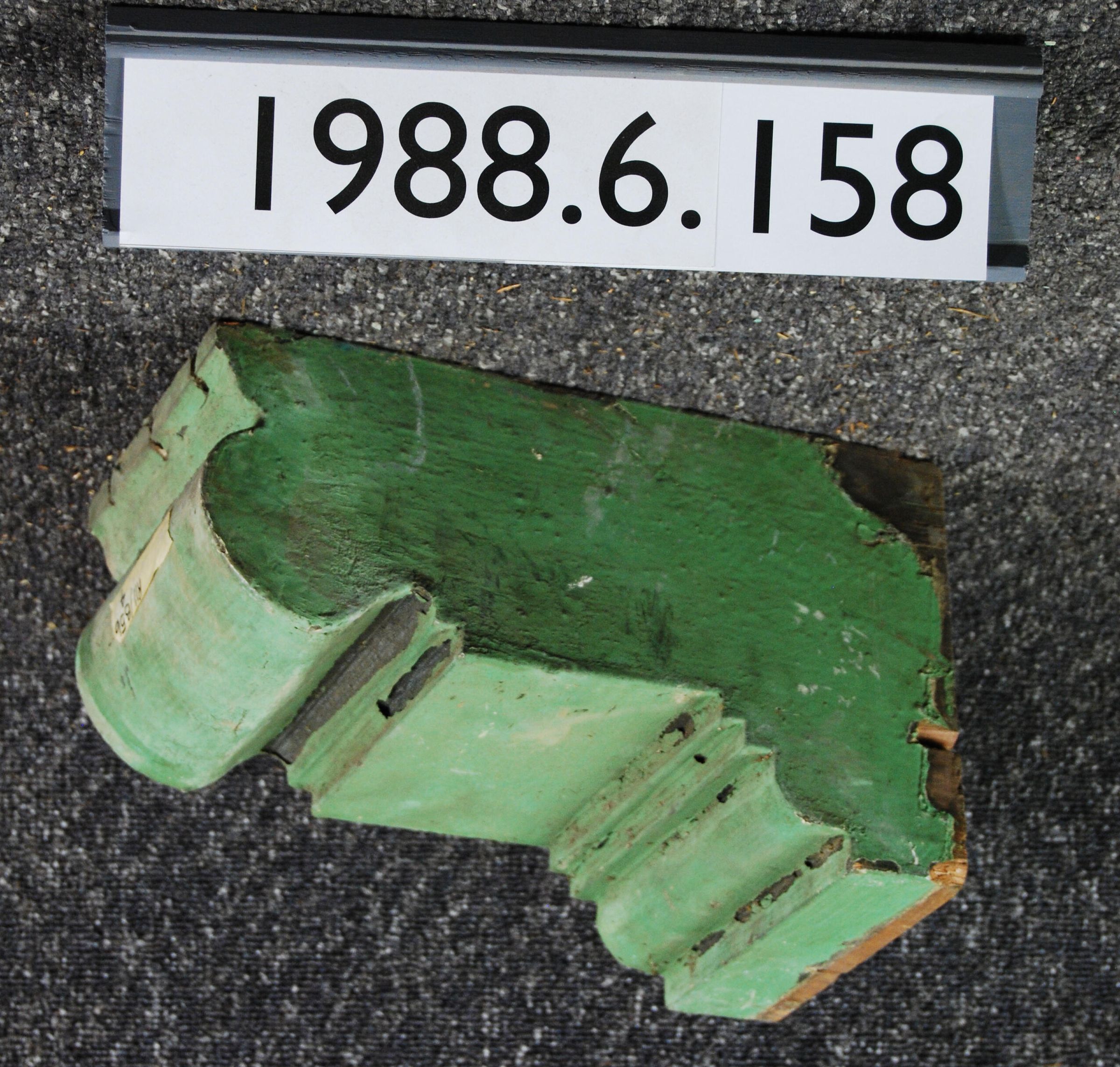 Wood bracket. Horizontall positioned. Compound contour Painted green. Inscriptions or Markings: Manufacturer: Place of Manufacturer: Design motif: Style: Finish: Painted