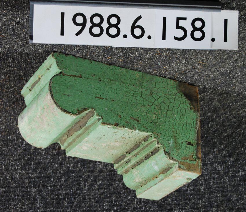 Wood bracket. Horizontall positioned. Compound contour Painted green. Inscriptions or Markings: Manufacturer: Place of Manufacturer: Design motif: Style: Finish: Painted