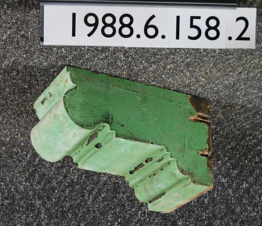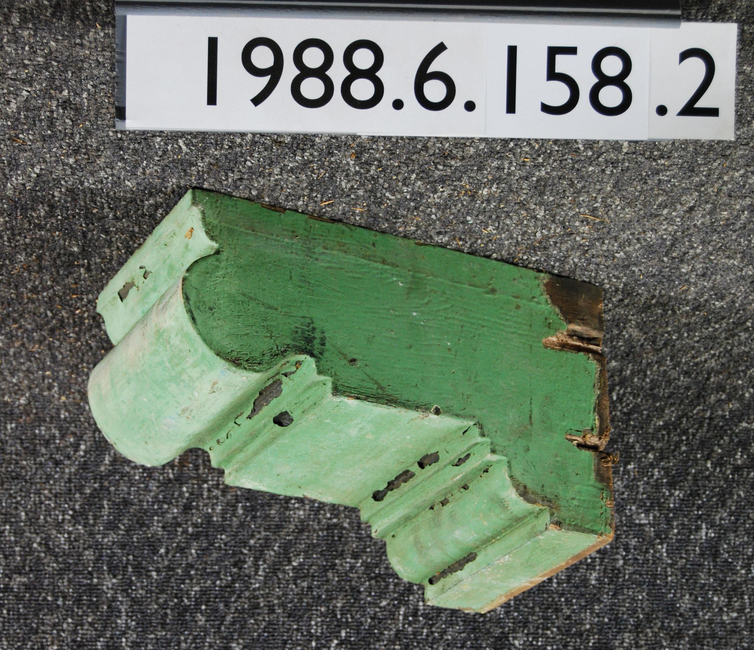Wood bracket. Horizontall positioned. Compound contour Painted green. Inscriptions or Markings: Manufacturer: Place of Manufacturer: Design motif: Style: Finish: Painted