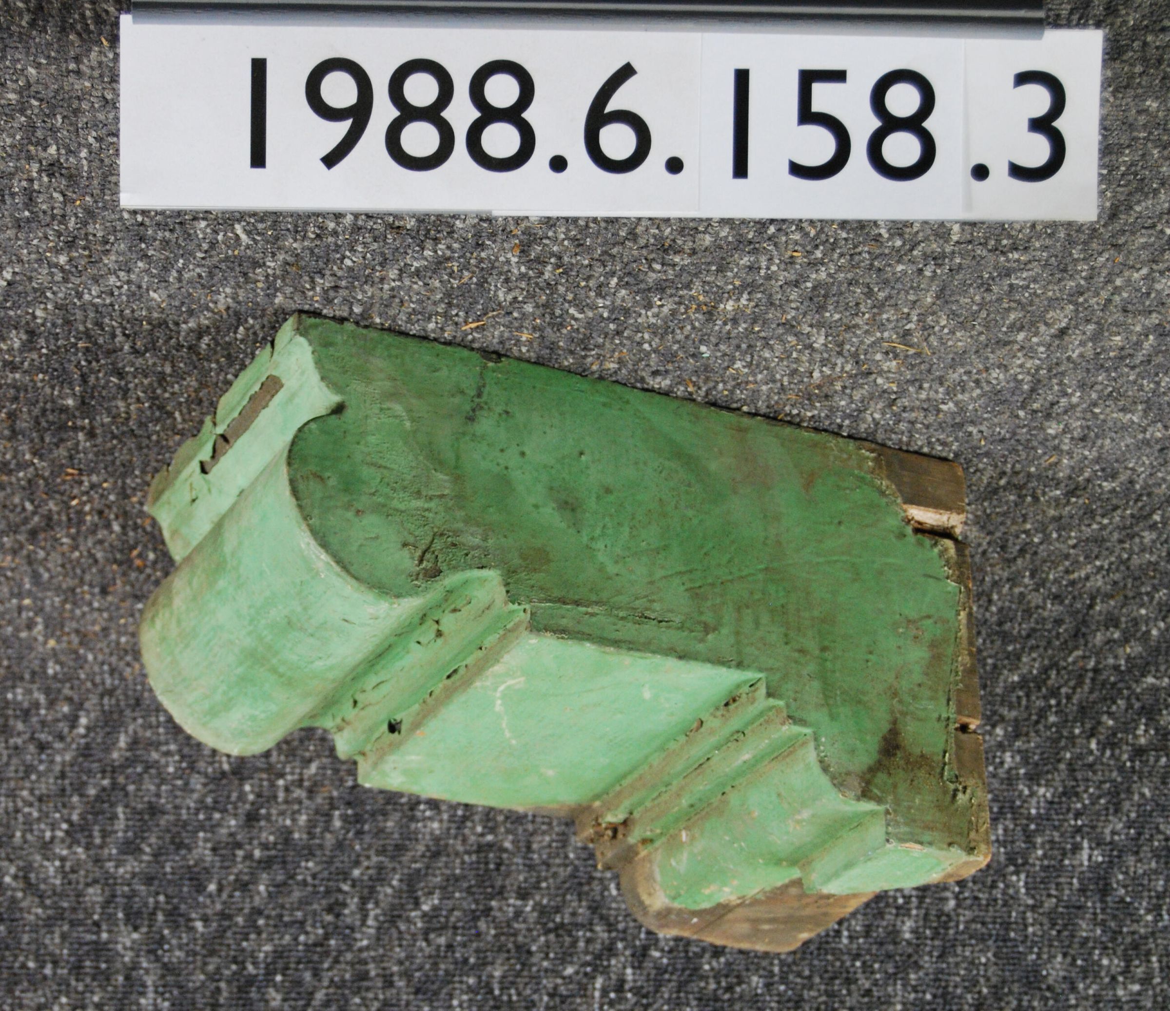 Wood bracket. Horizontall positioned. Compound contour Painted green. Inscriptions or Markings: Manufacturer: Place of Manufacturer: Design motif: Style: Finish: Painted