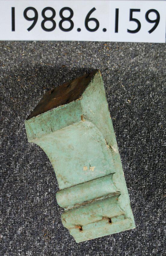 Wood bracket. Angular top. Compound contour Painted green. Inscriptions or Markings: Manufacturer: Place of Manufacturer: Design motif: Style: Finish: Painted