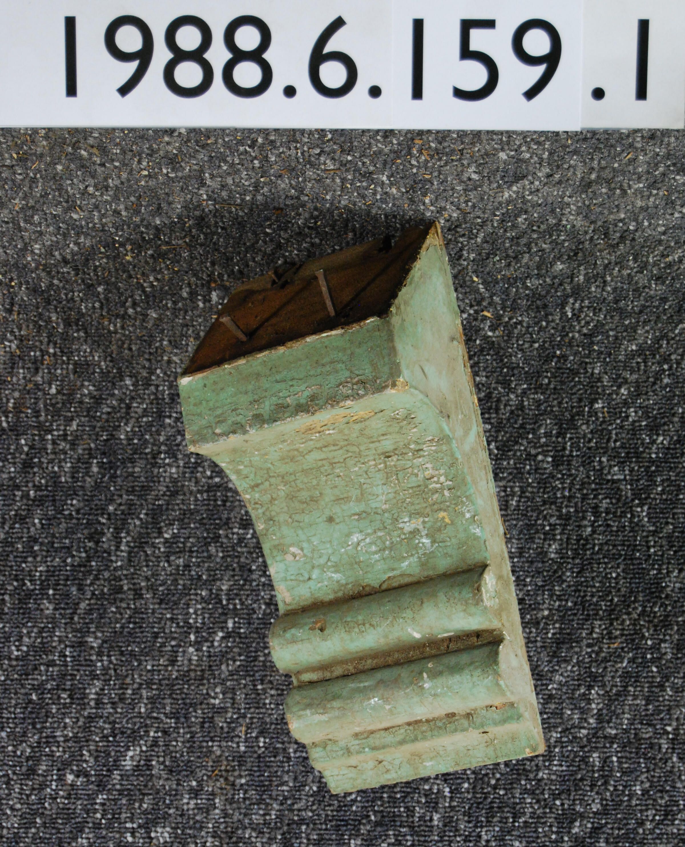 Wood bracket. Angular top. Compound contour Small piece missing on backside. Painted green. Inscriptions or Markings: Manufacturer: Place of Manufacturer: Design motif: Style: Finish: Painted