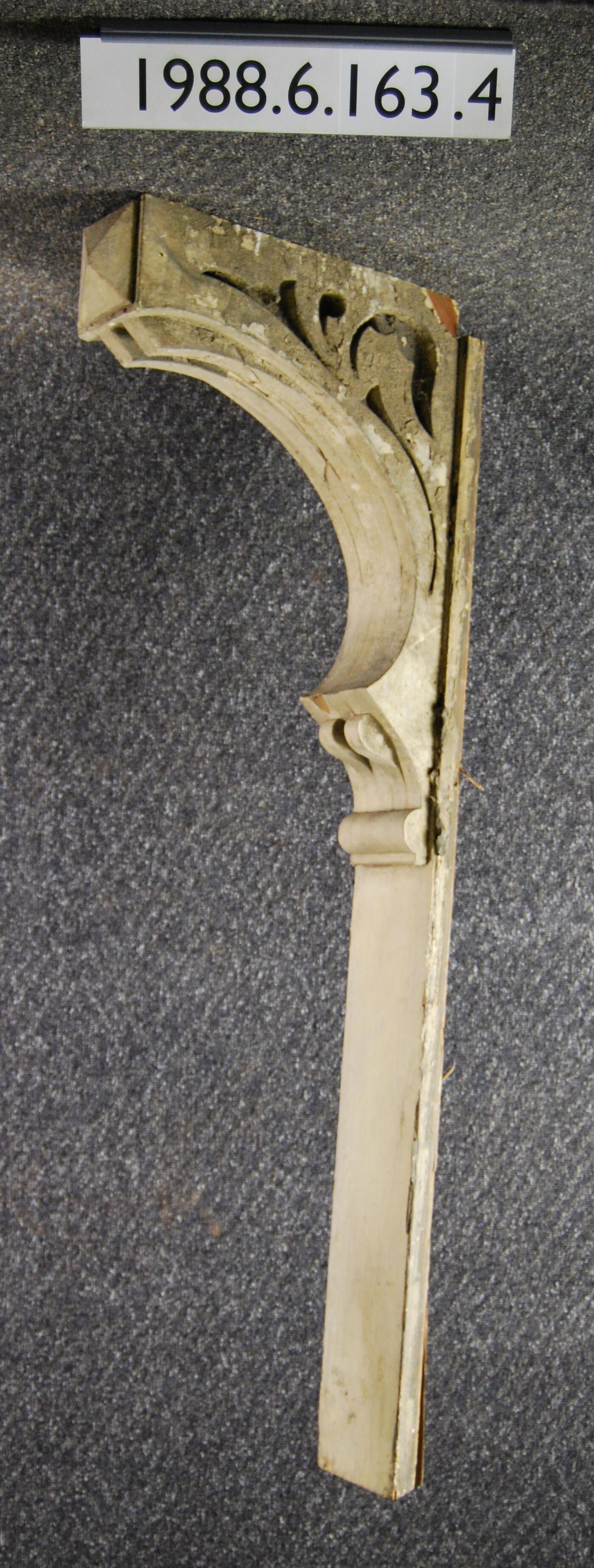 Wood bracket. Scrolled. Fret-cut sides. Curved profile. Upper composed of laminated sections. (Broken). Front has pyramidal block ornament. Painted beige. Inscriptions or Markings: Manufacturer: Place of Manufacturer: Design motif: Style: Finish: Painted