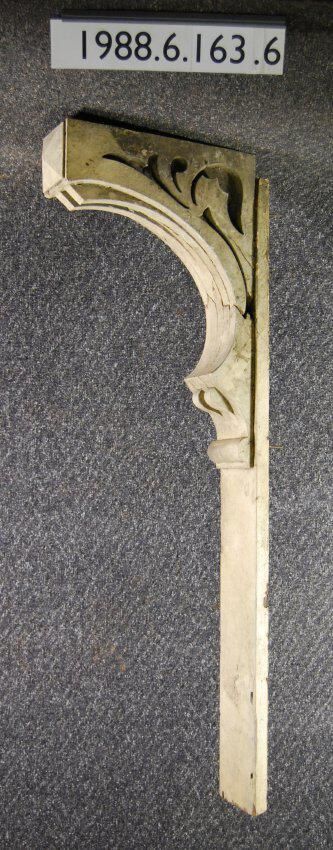 Wood bracket. Scrolled. Fret-cut sides. Curved profile. Upper composed of laminated sections. (Broken). Front has pyramidal block ornament. Painted beige. Inscriptions or Markings: Manufacturer: Place of Manufacturer: Design motif: Style: Finish: Painted