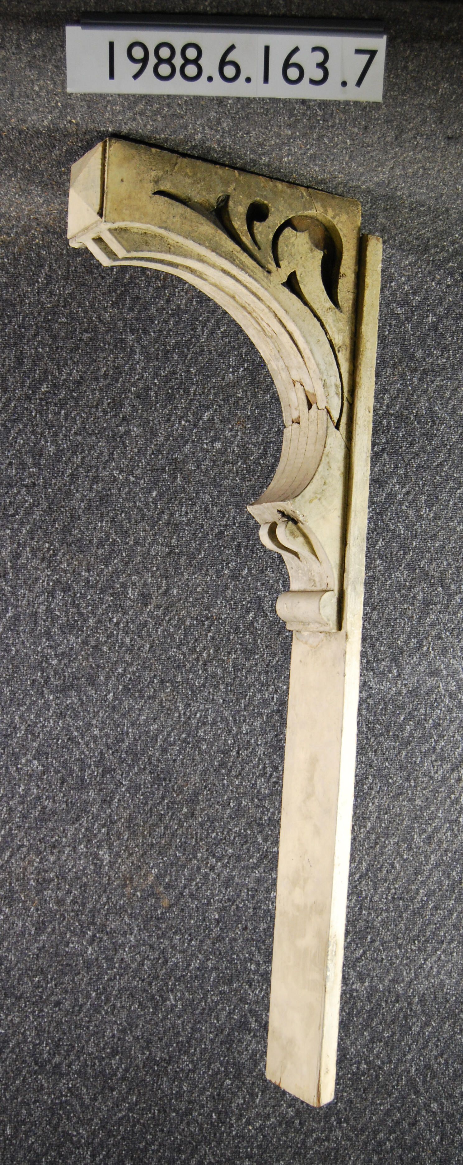 Wood bracket. Scrolled. Fret-cut sides. Curved profile. Upper composed of laminated sections. (Broken). Front has pyramidal block ornament. Painted beige. Inscriptions or Markings: Manufacturer: Place of Manufacturer: Design motif: Style: Finish: Painted