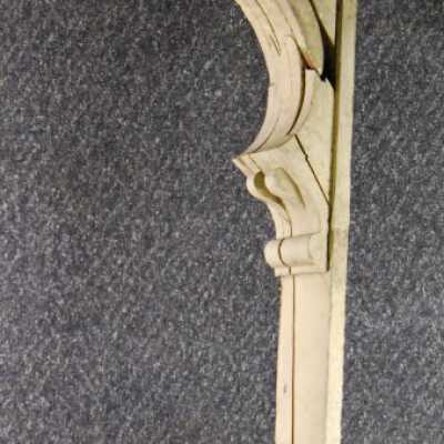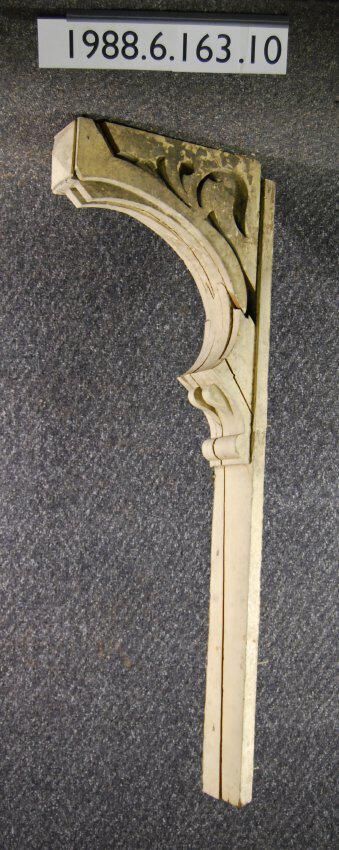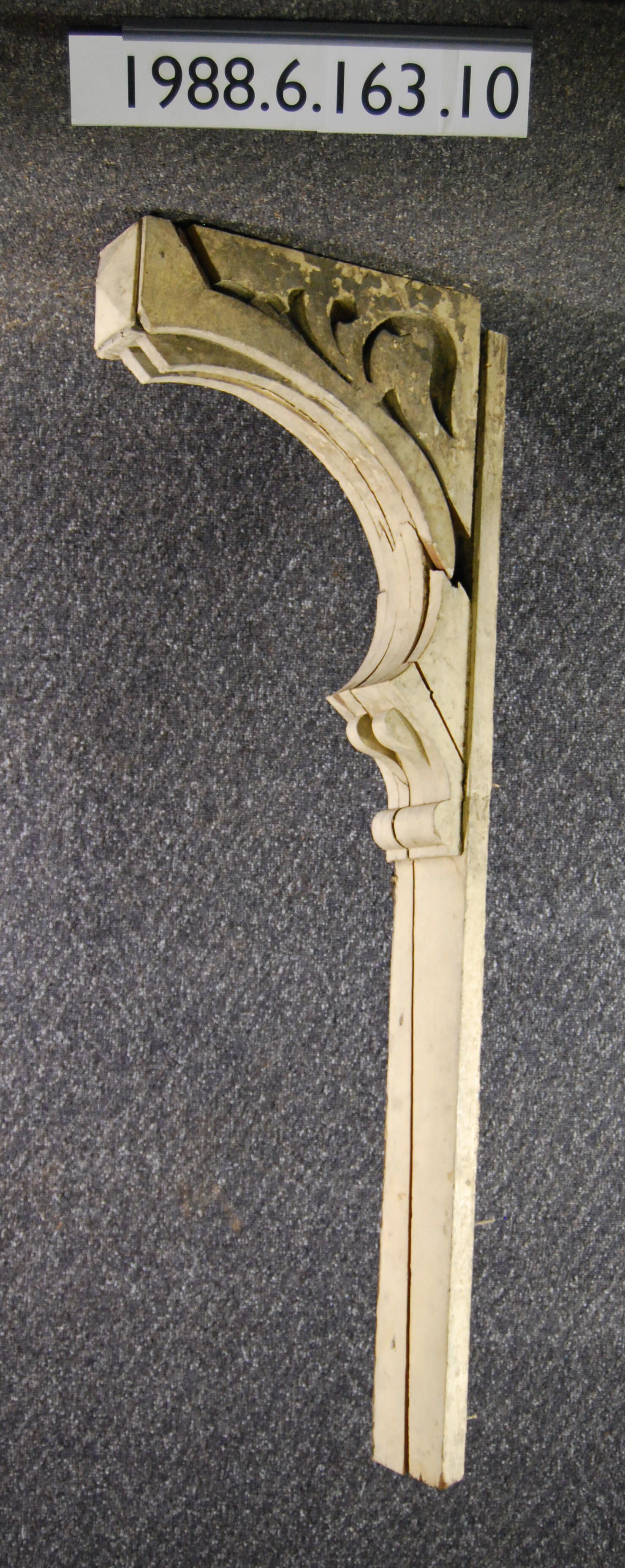 Wood bracket. Scrolled. Fret-cut sides. Curved profile. Upper composed of laminated sections. (Broken). Front has pyramidal block ornament. Painted beige. Inscriptions or Markings: Manufacturer: Place of Manufacturer: Design motif: Style: Finish: Painted