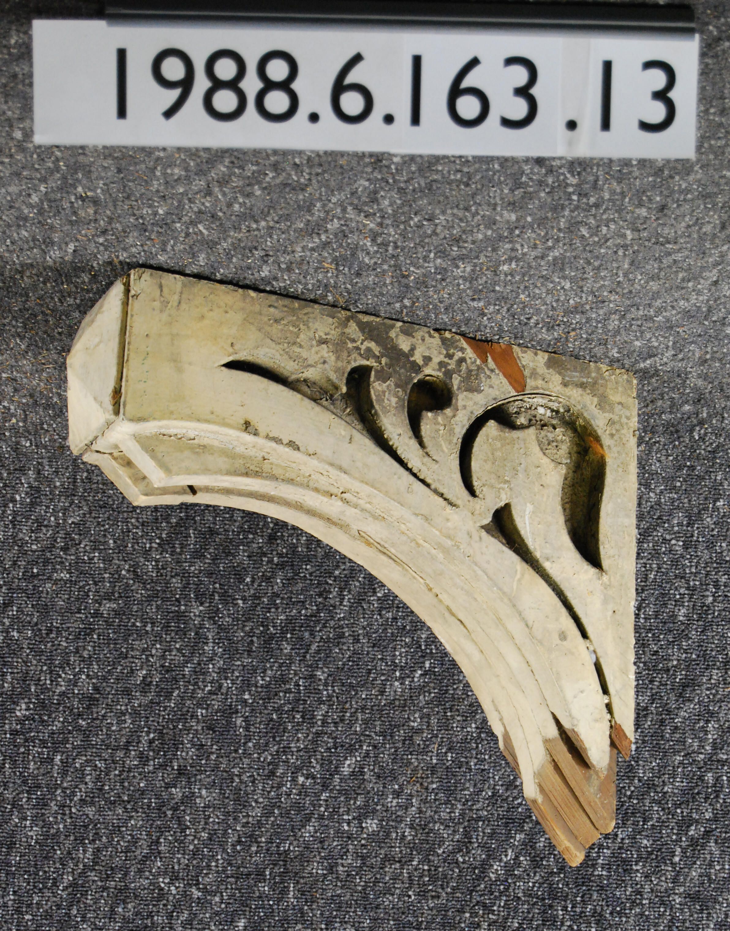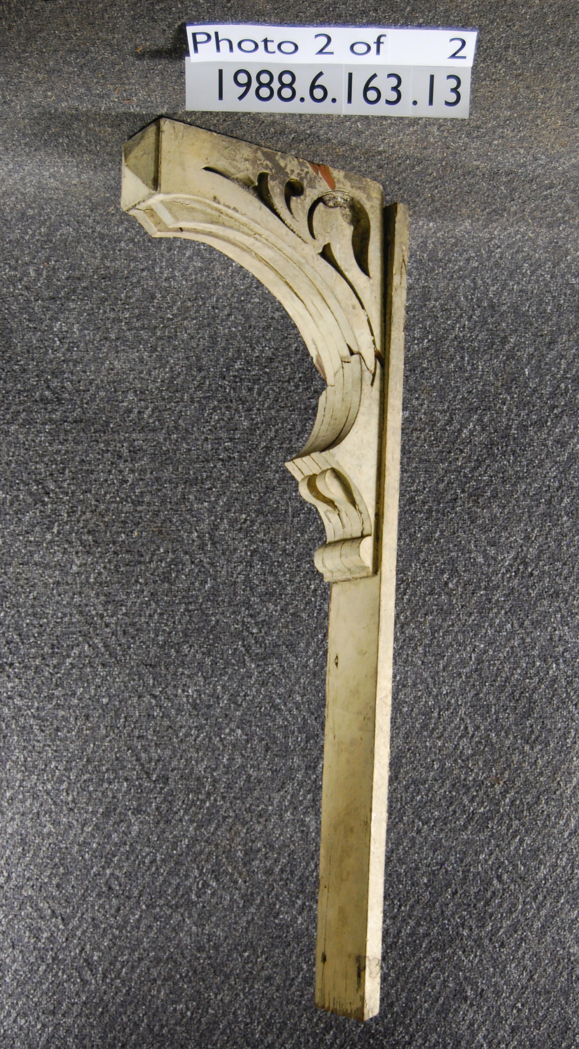 Wood bracket. Scrolled. Fret-cut sides Curved profile. Upper composed of laminated sections (broken). Front has pyramidal block ornament. Lower part truncated. Painted beige.