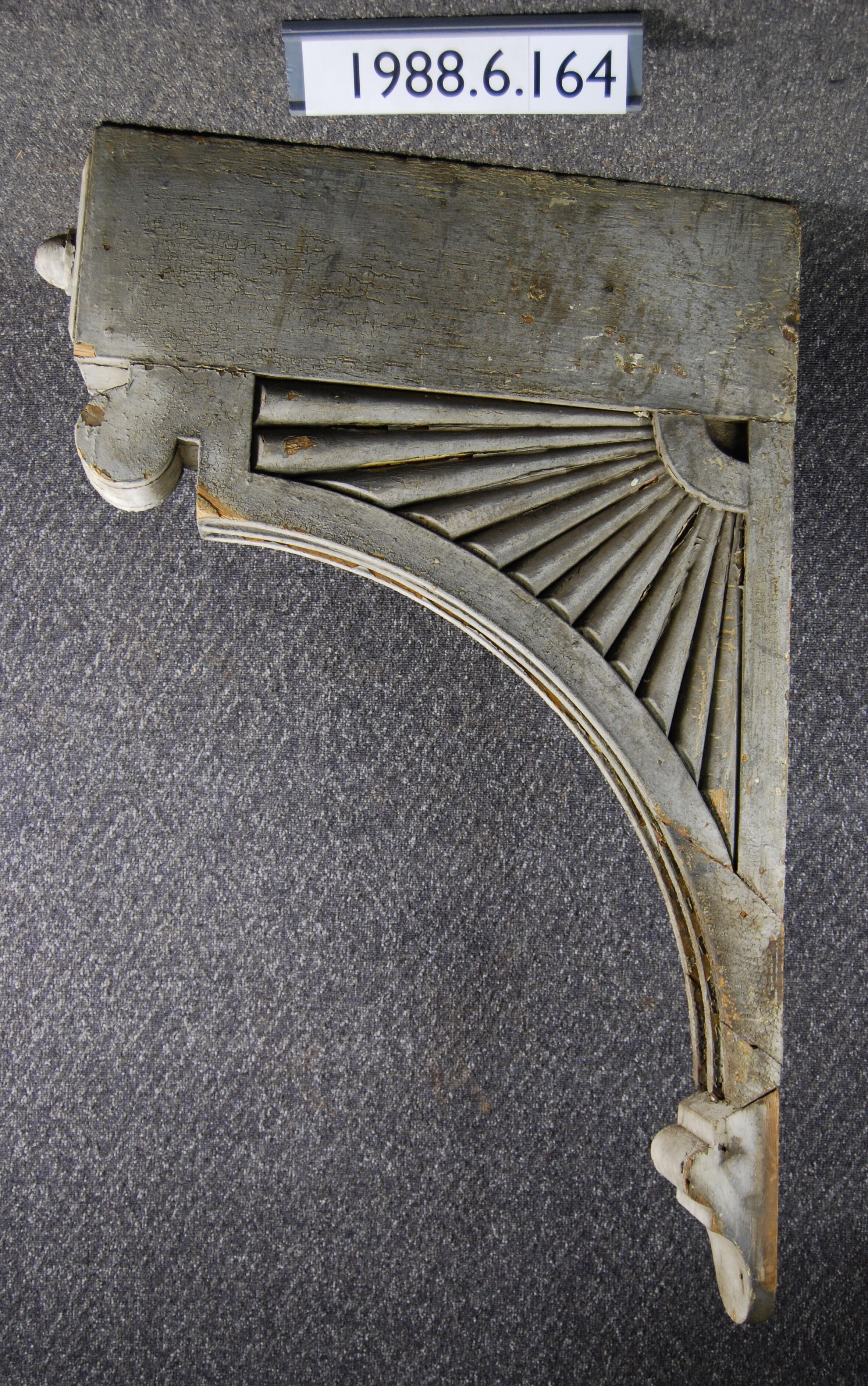 Wood bracket. Sunburst motif on one side. Compound contour. Partially fluted front. Drop ornament at bottom. Painted grey. Inscriptions or Markings: Manufacturer: Place of Manufacturer: Design motif: Style: Finish: Painted