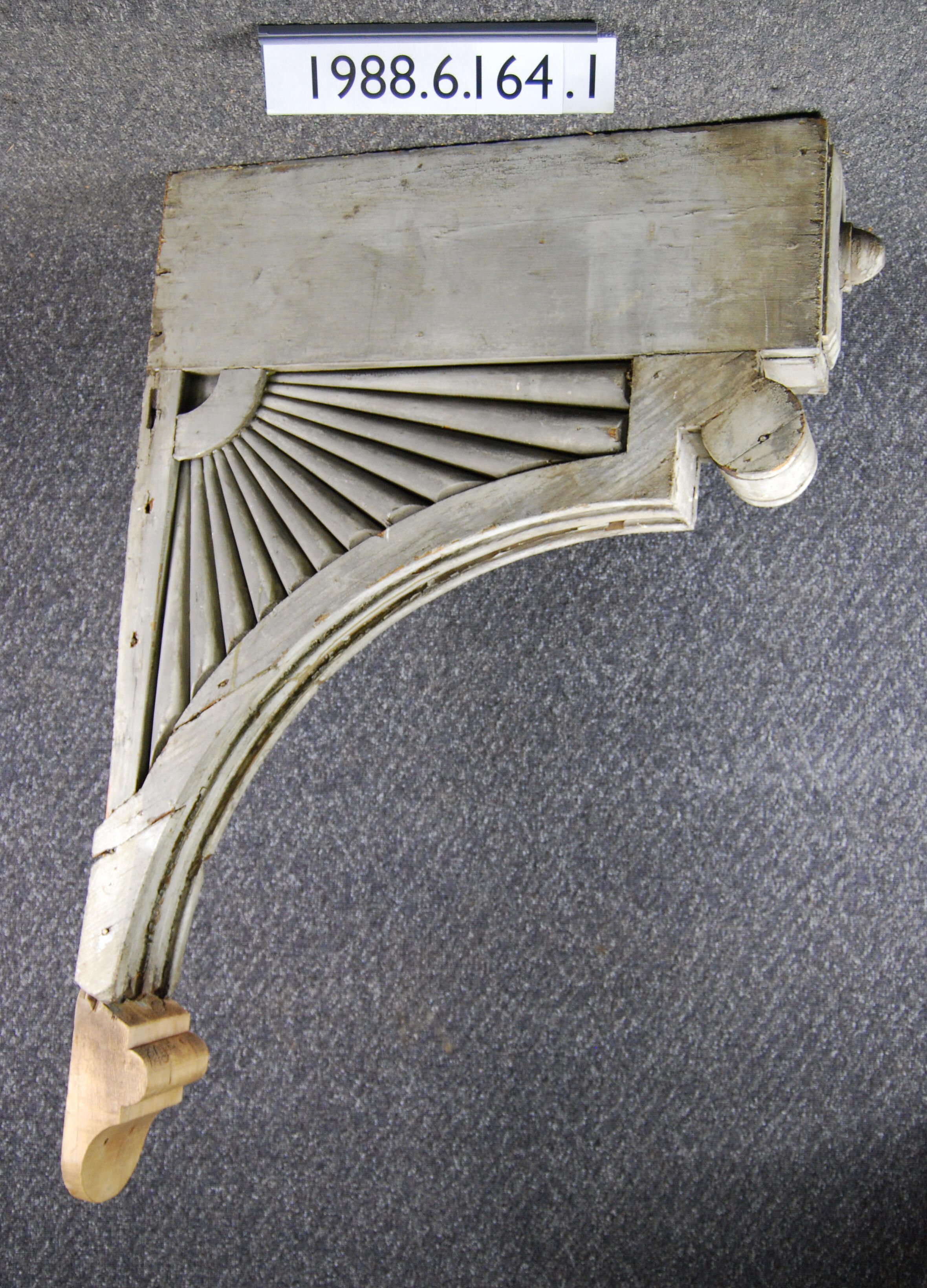 Wood bracket. Sunburst motif on one side. Compound contour. Partially fluted front. Stripped drop ornament at bottom. Painted grey. Inscriptions or Markings: Manufacturer: Place of Manufacturer: Design motif: Style: Finish: Painted