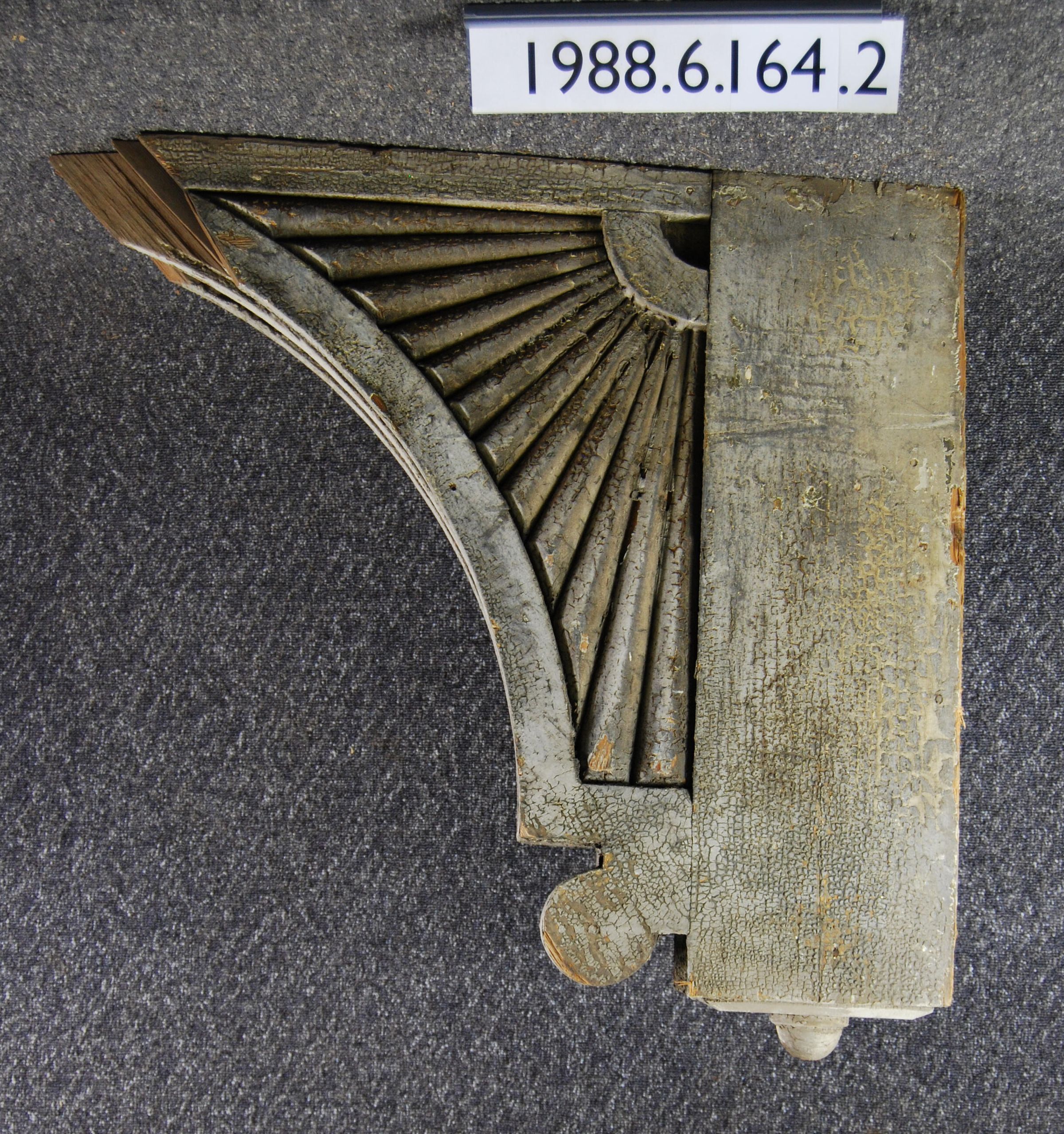 Wood bracket. Sunburst motif on one side. Compound contour. Partially fluted front. Lower end truncated. Painted grey. Inscriptions or Markings: Manufacturer: Place of Manufacturer: Design motif: Style: Finish: Painted