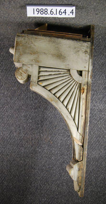 Wood bracket. Sunburst motif on one side. Compound contour. Partially fluted front. Drop ornament at bottom. Painted grey. Inscriptions or Markings: Manufacturer: Place of Manufacturer: Design motif: Style: Finish: Painted