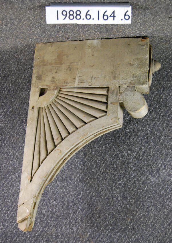 Wood bracket. Sunburst motif on one side. Compound contour. Partially fluted front. Lower end truncated. Painted grey. Inscriptions or Markings: Manufacturer: Place of Manufacturer: Design motif: Style: Finish: Painted