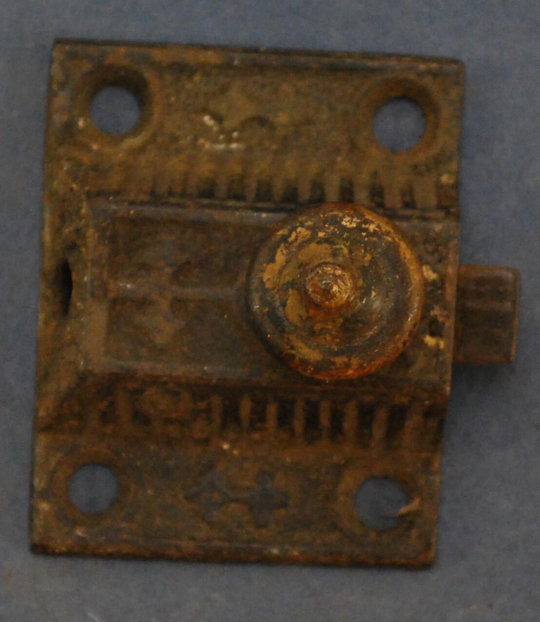 Comments: Spring and part missing, catch is missing, iron body, bronze knob.