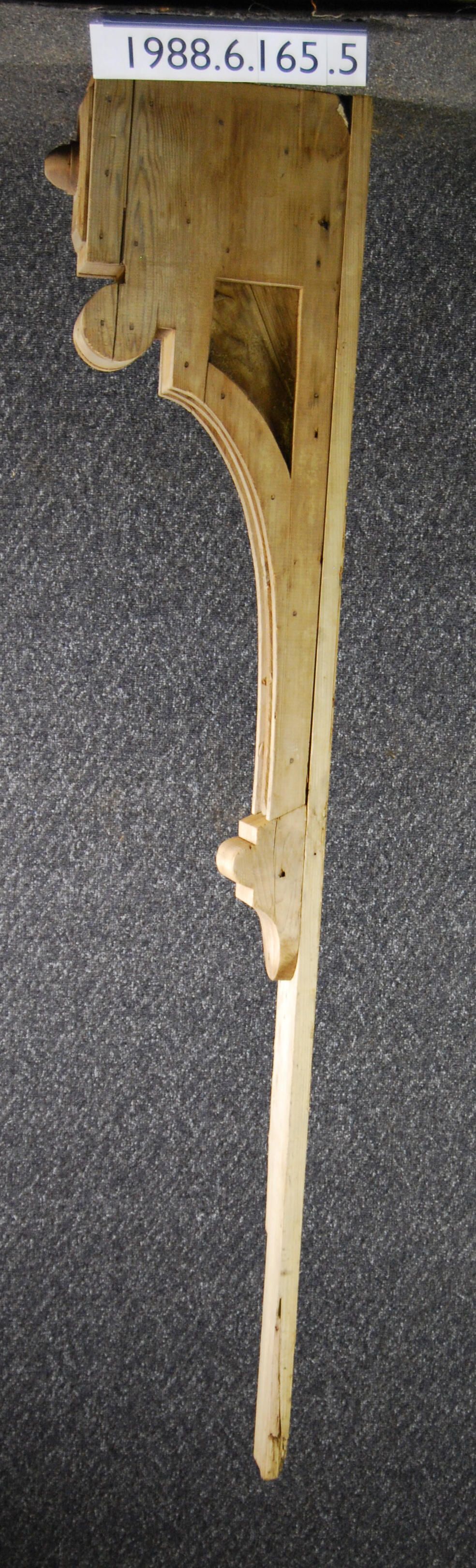 Wood bracket. Compound contour. Recessed panel on each side. Board backing. Partially fluted front. Stripped of paint.. Inscriptions or Markings: Manufacturer: Place of Manufacturer: Design motif: Style: Finish: Stripped