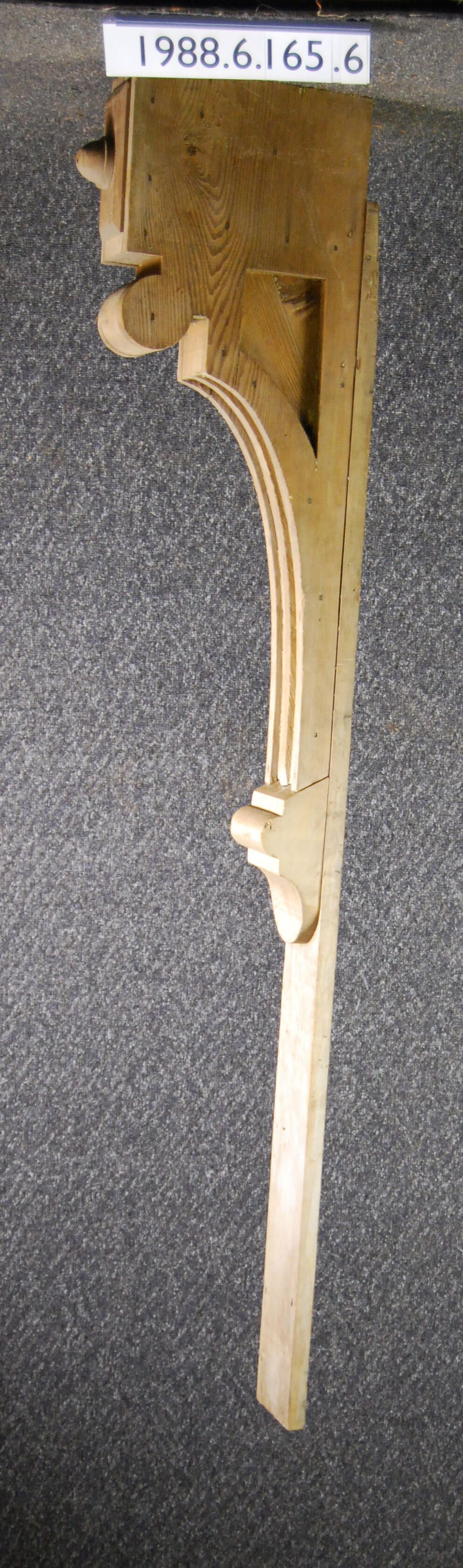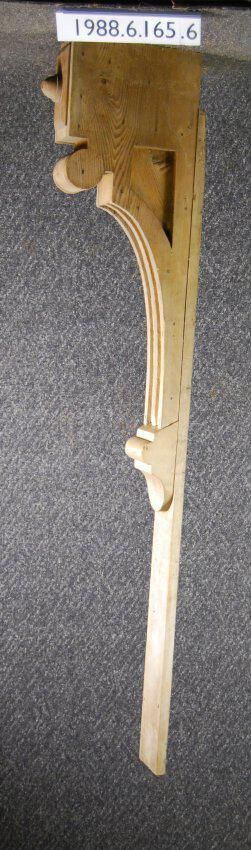 Wood bracket. Compound contour. Recessed panel on each side. Board backing. Partially fluted front. Stripped of paint.. Inscriptions or Markings: Manufacturer: Place of Manufacturer: Design motif: Style: Finish: Stripped