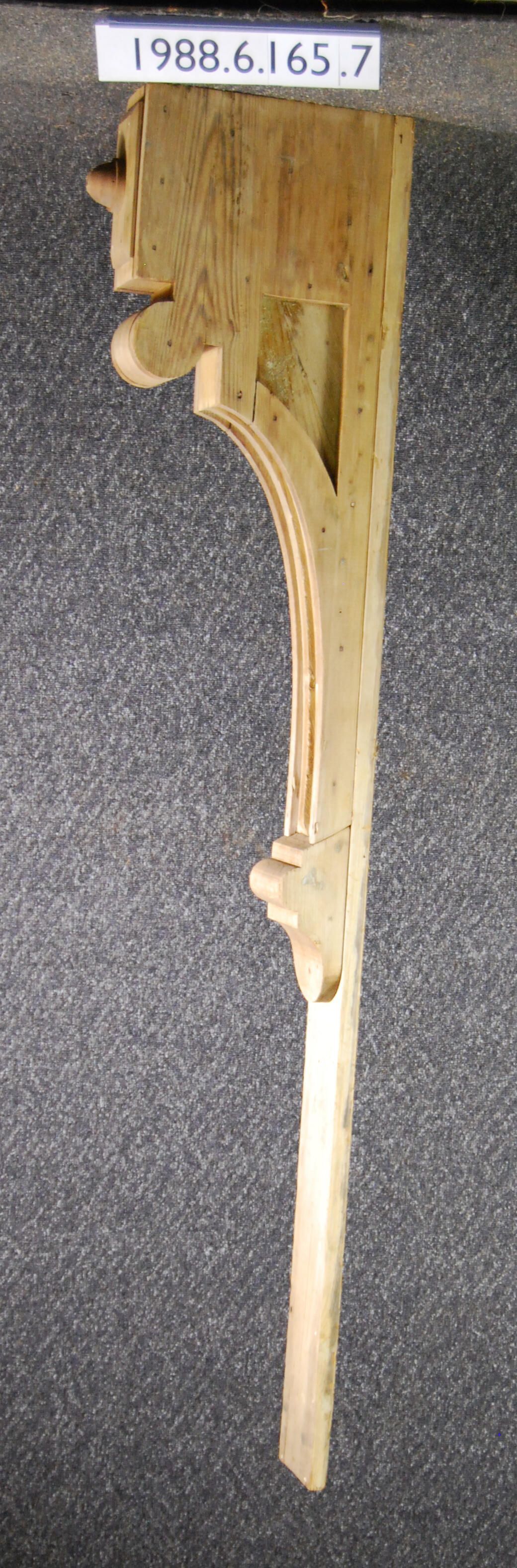 Wood bracket. Compound contour. Recessed panel on each side. Board backing. Partially fluted front. Stripped of paint.. Inscriptions or Markings: Manufacturer: Place of Manufacturer: Design motif: Style: Finish: Stripped