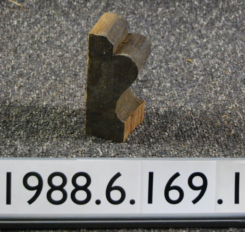 Wood bracket. Compound contour. Cut from solid block. Front part missing. Including ornamental drop. Stained and varnished finish. (Interior bracket).