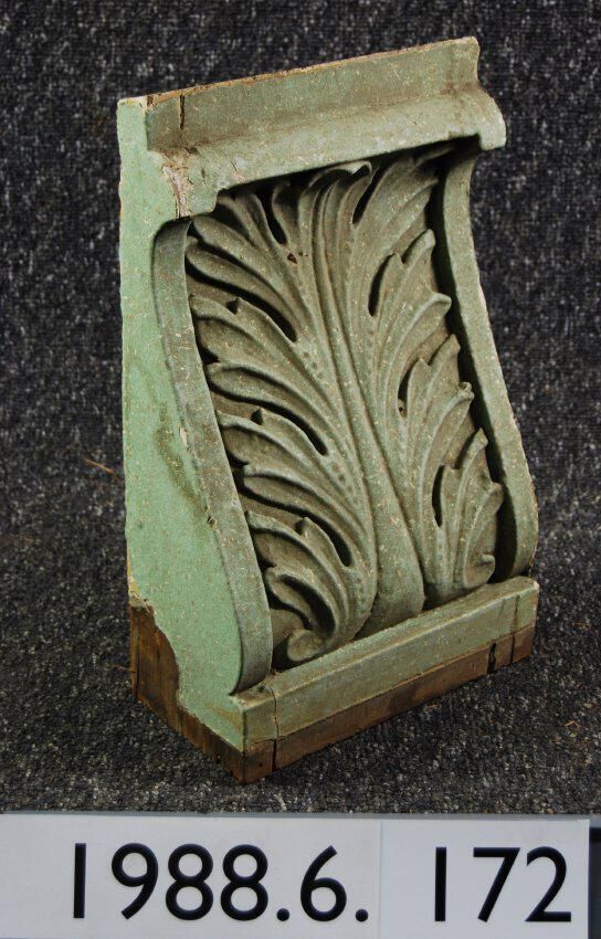 Wood bracket. Compound profile. Front has carved acanthus motif ornamentation. Painted green with white speckles. Inscriptions or Markings: Manufacturer: Place of Manufacturer: Design motif: Style: Finish: Painted