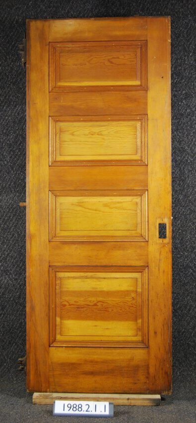Interior pocket door. Four panels with applied moldings. Original handles and lock / latch are missing. Has original cast iron hardware for mounting to glide mechanism. From the Captain John Brown House, Portland, Oregon. Building demolished in 1973. Varnished finish.