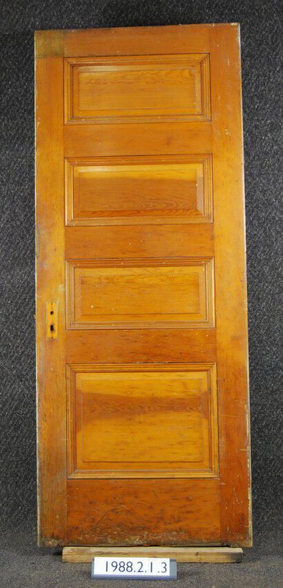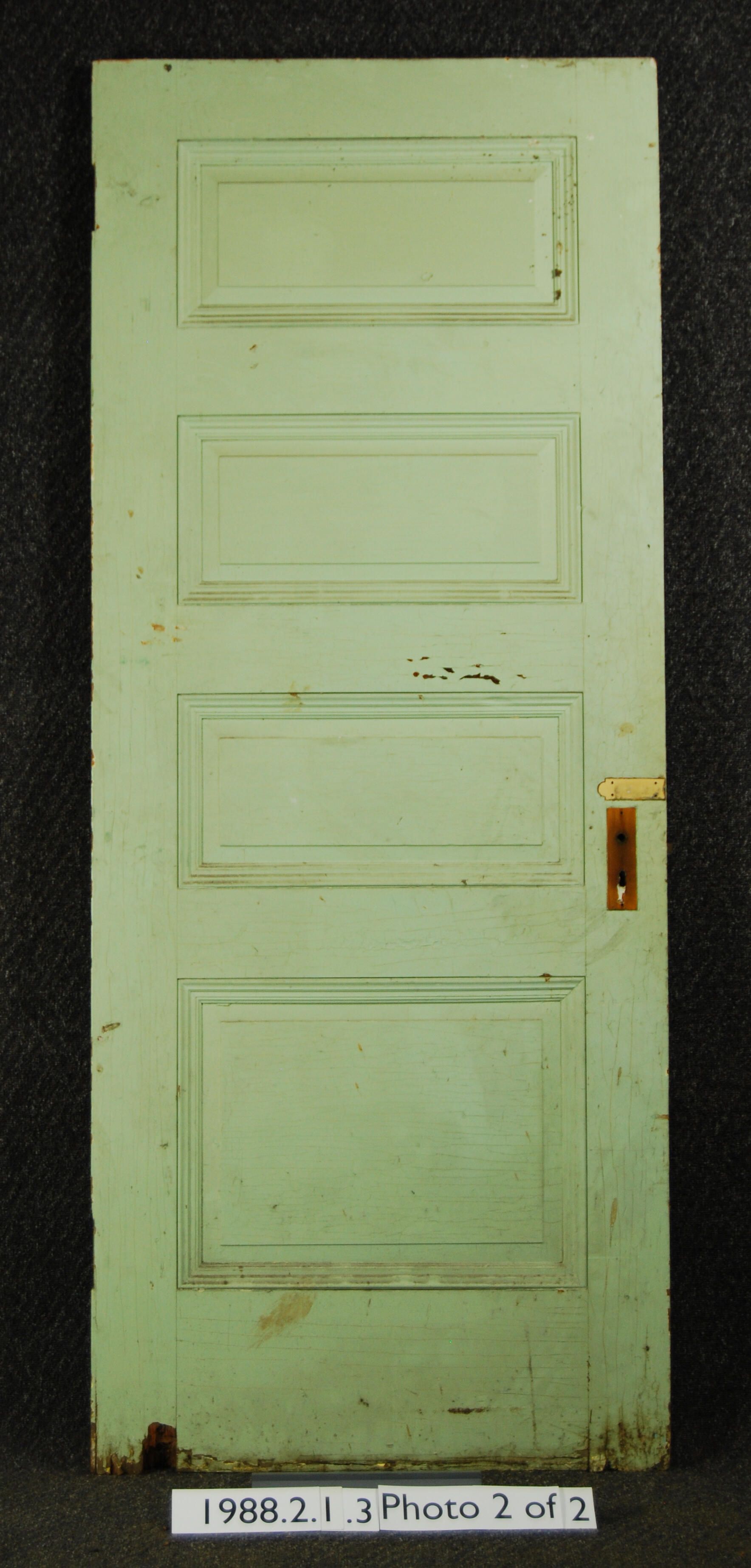 Interior / Exterior door. Four panels. Latch is present - rest of hardware missing. From the Captain John Brown House, Portland, Oregon. Building demolished in 1973. Rot on bottom. Varnished on one side, painted light green on other side.