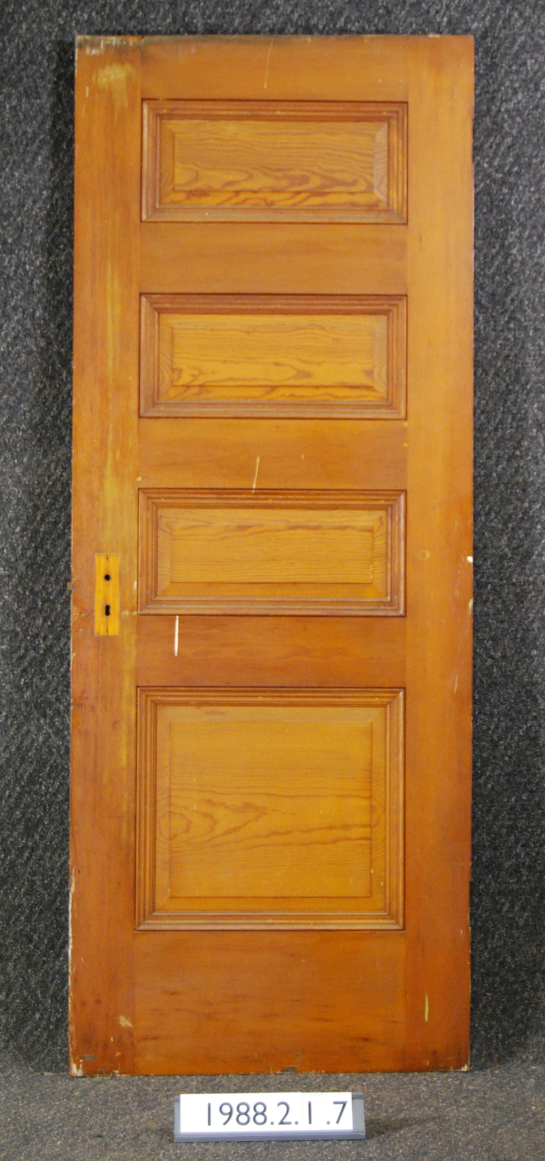 Interior door. Four panels with applied molding. Has mortice lock. All other hardware is missing. From the Captain John Brown House, Portland, Oregon. Building demolished in 1973. Varnished on both sides.