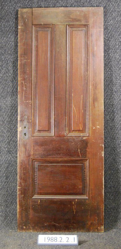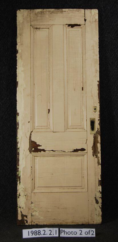 Interior door. Three panel with applied molding. Has mortice lock. All other hardware is missing. Varnished on one side - other side painted beige.