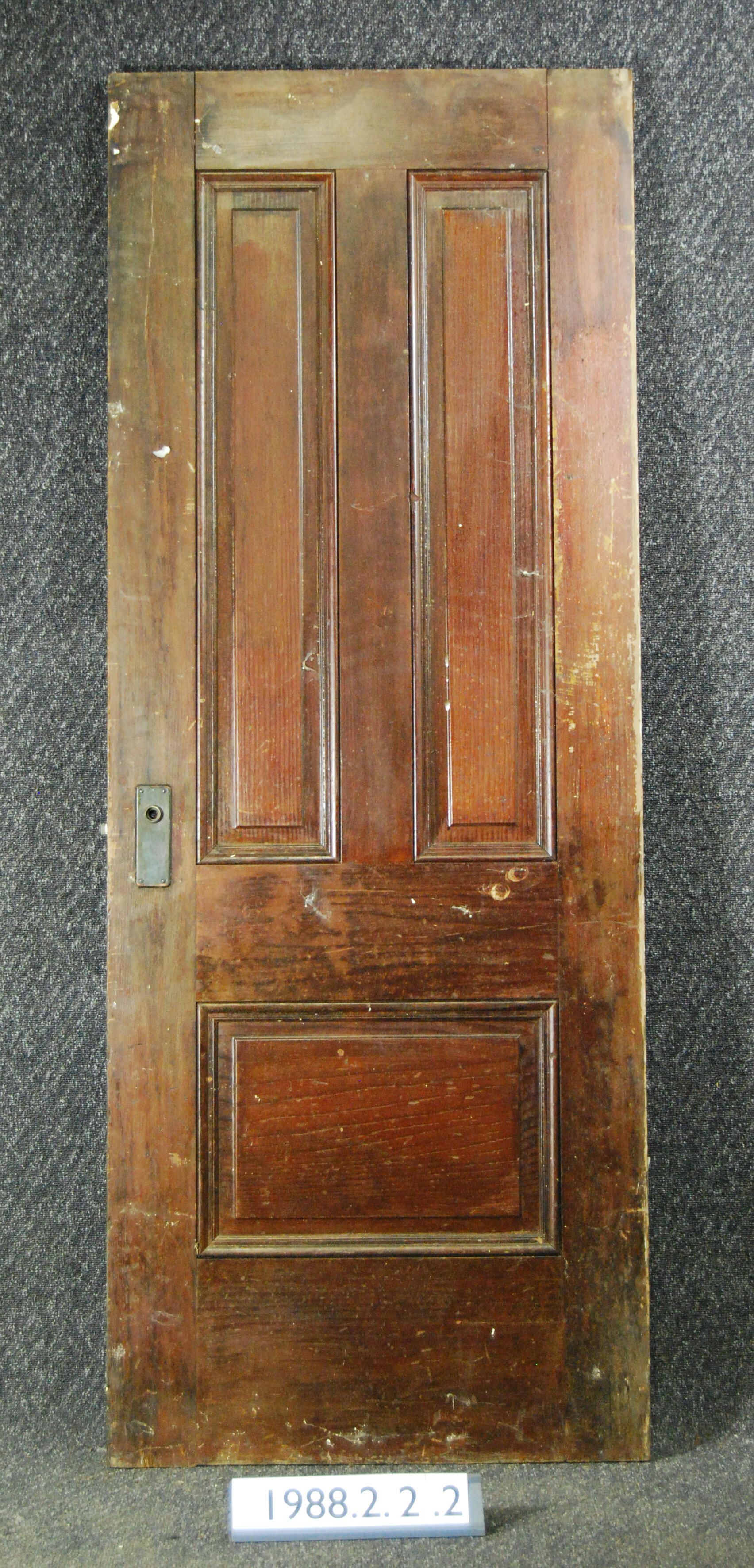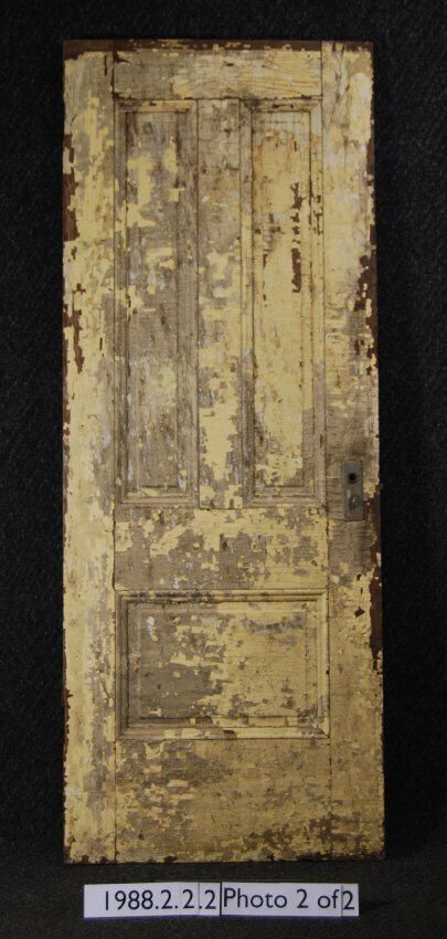 Interior door. Three panels with applied moldings. Has mortice lock. All other hardware is missing. Varnished on one side - other side painted beige.