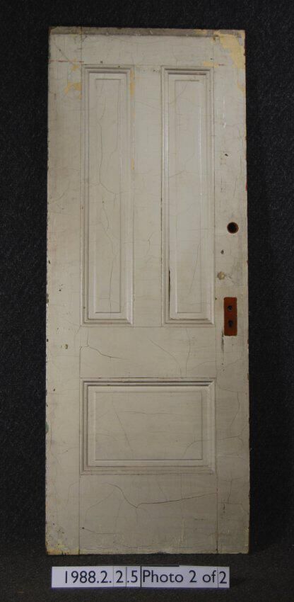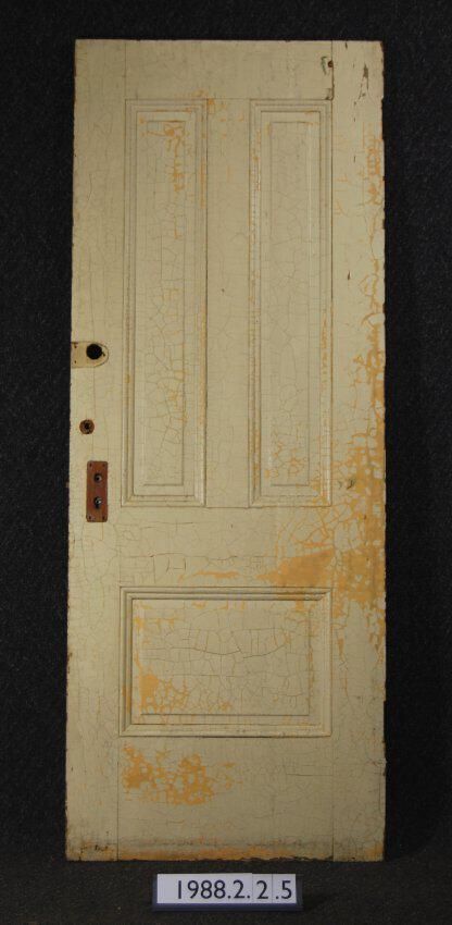 Interior / Exterior door. Three panels with applied moldings. Has mortice lock and dead bolt. All other hardware is missing. Painted cream colored on one side - painted yellow on other side (peeling).