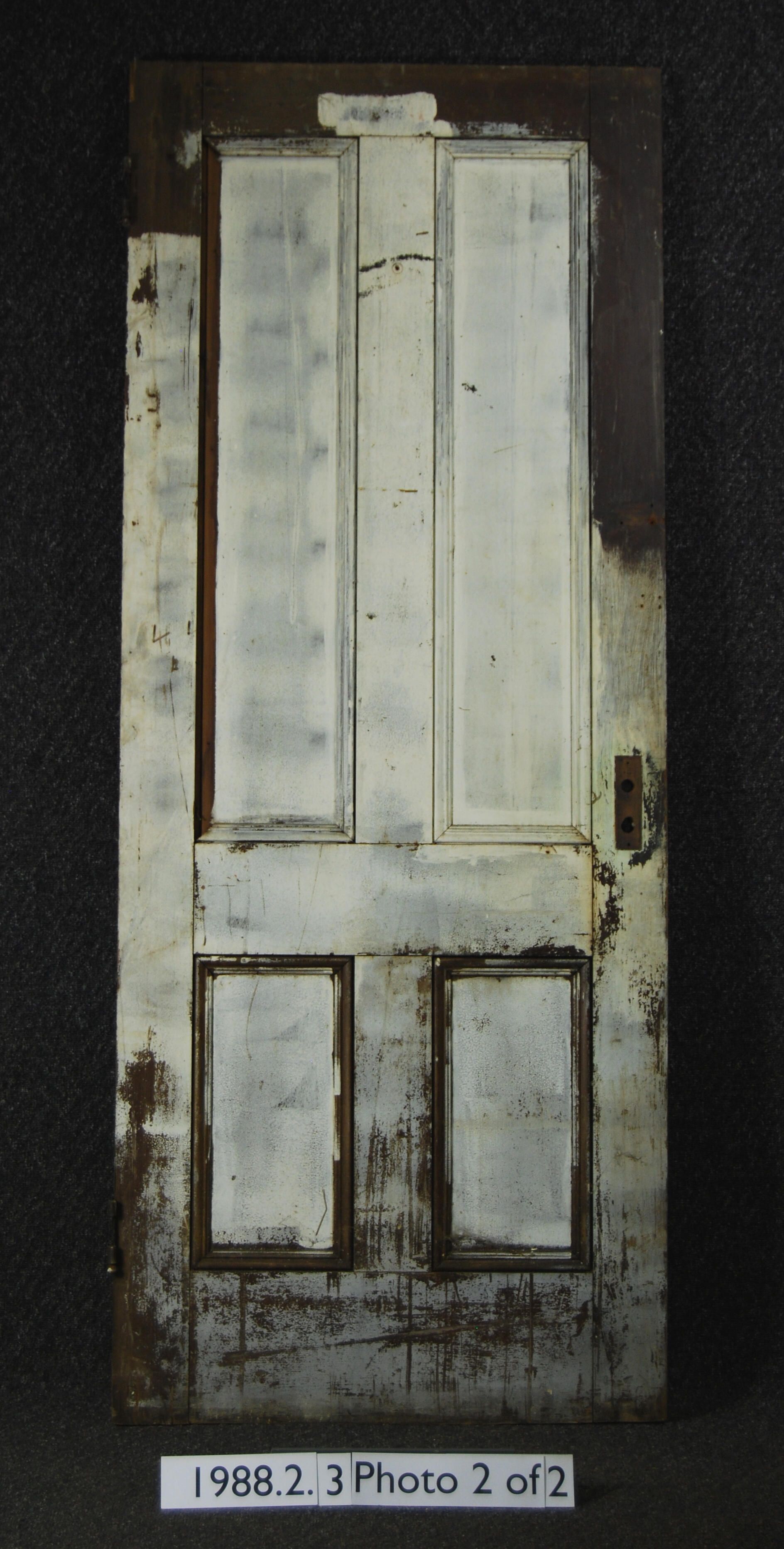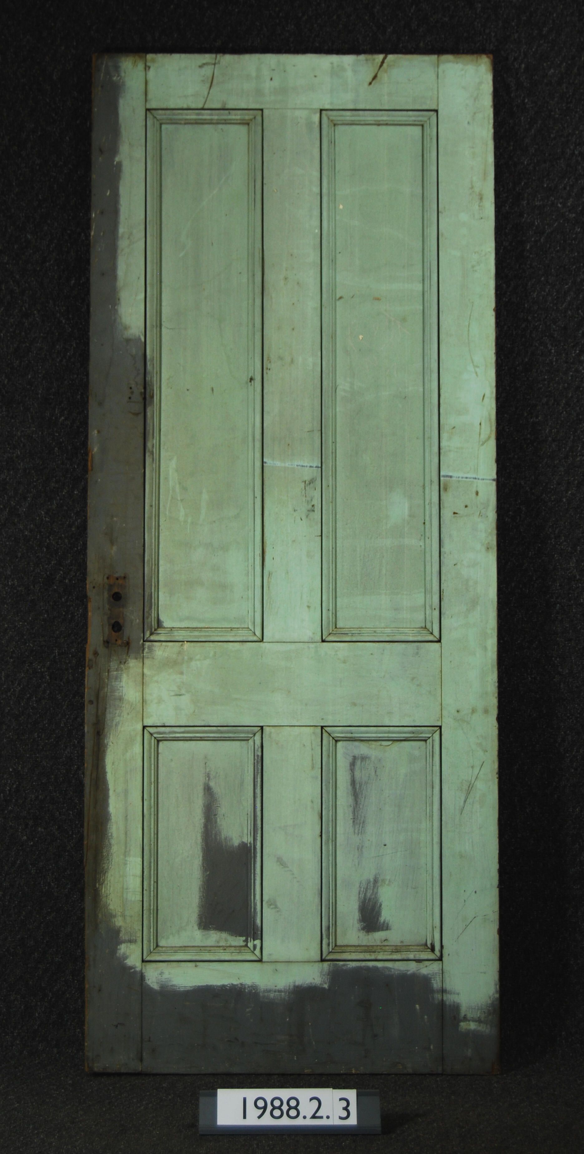 Interior / Exterior door. Four panels with applied moldings. (One molding is missing). Has one hinge leaf at top and bottom. -- Other half of each hinge leaf is missing. All other hardware is missing. Painted green on one side - painted cream colored on other side.