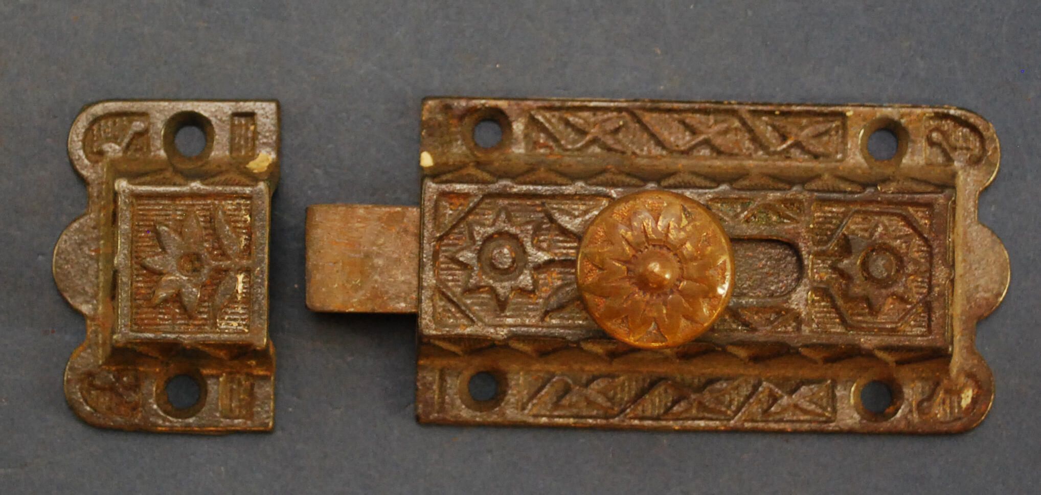 Comments: Sliding bolt, iron body, bronze knob. Complete with strike.