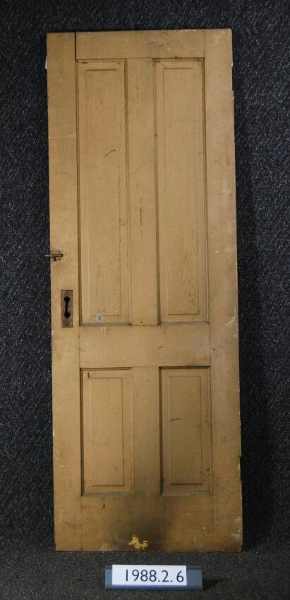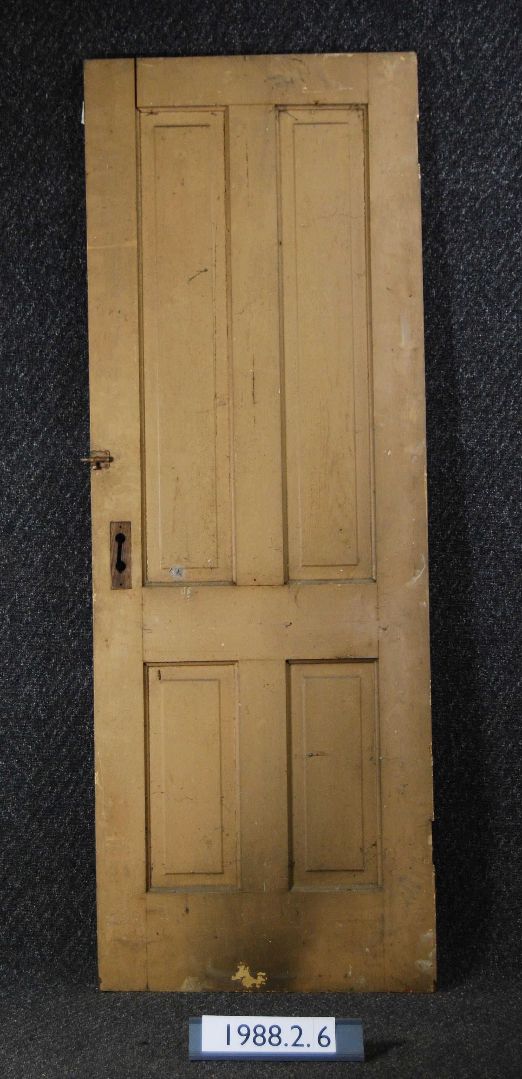 Interior door. Four panels. Has sliding bolt. All other hardware is missing, including mortice lock. Painted brown on both sides. Inscriptions or Markings: Manufacturer: Place of Manufacturer: Design Motif: Style: Finish: Painted