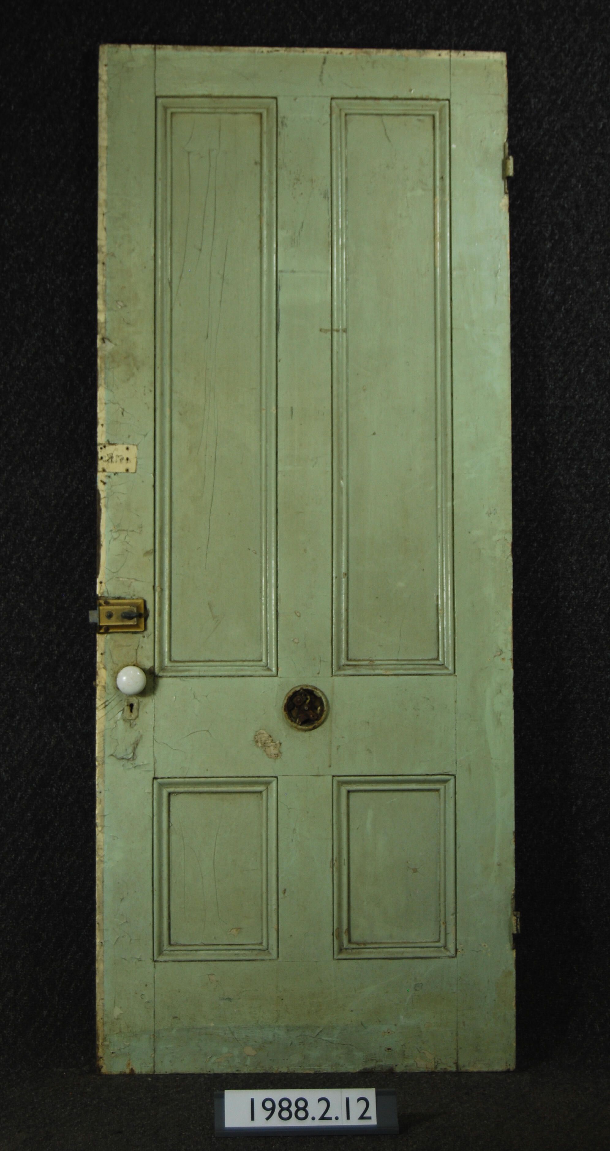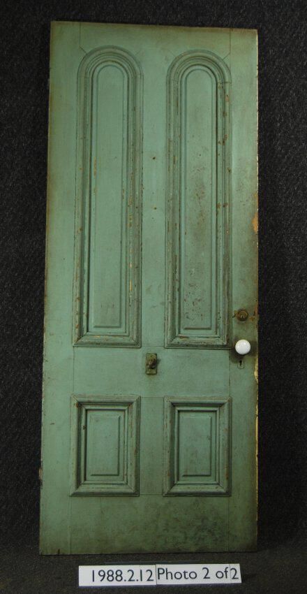 Exterior door. Four panels. The two top panels on exterior side have arched tops. Applied moldings. Has incomplete key-wind doorbell. Complete mortice lock. Key hole escutcheon plates. Two white porcelain doorknobs. Has two original hinge leaves. Has modern cylinder lock. Painted green on both sides.