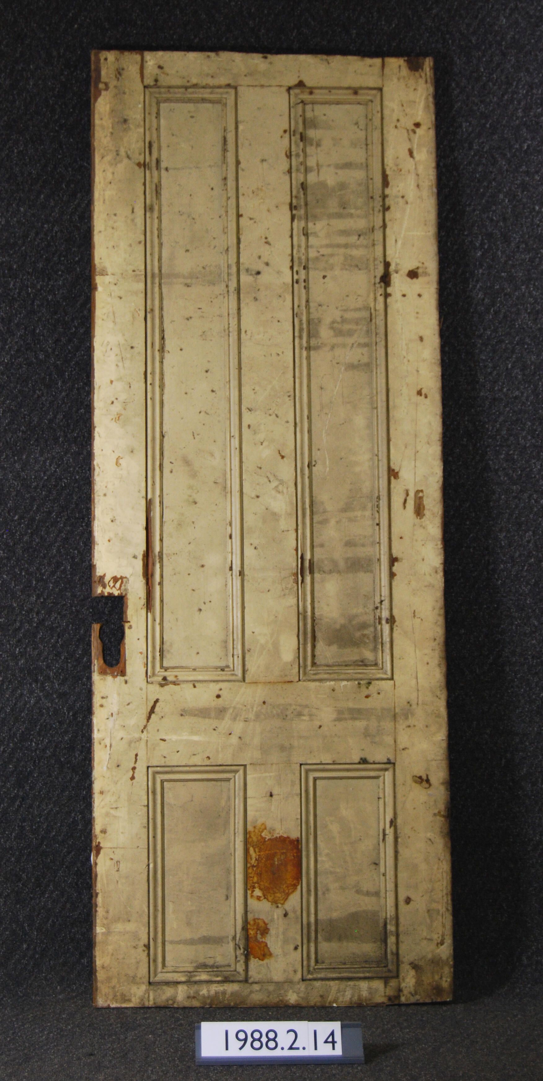 Interior / Exterior door. Four panels. Applied moldings. All original hardware is missing. Edges of door have been cut down (possibly modified pocket door?) Piece missing at lock mortice. Painted tan / yellow on both sides.