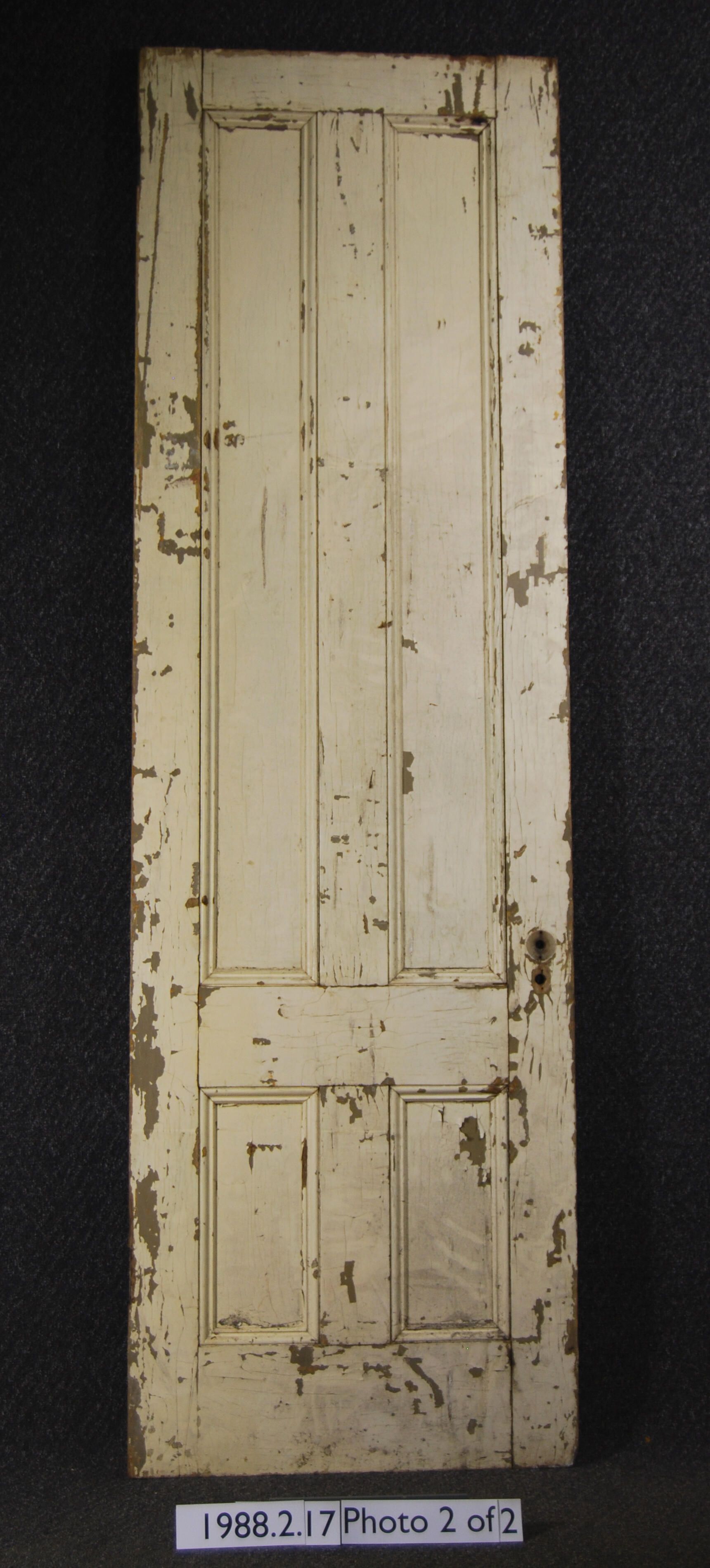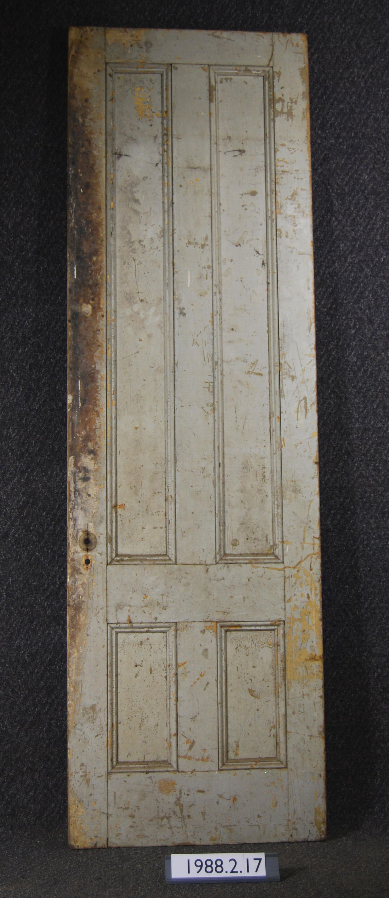 Exterior door. Four panels with applied moldings. All hardware is missing. Painted grey on one side - painted beige on other side. Inscriptions or Markings: Manufacturer: Place of Manufacturer: Design Motif: Style: Finish: Painted