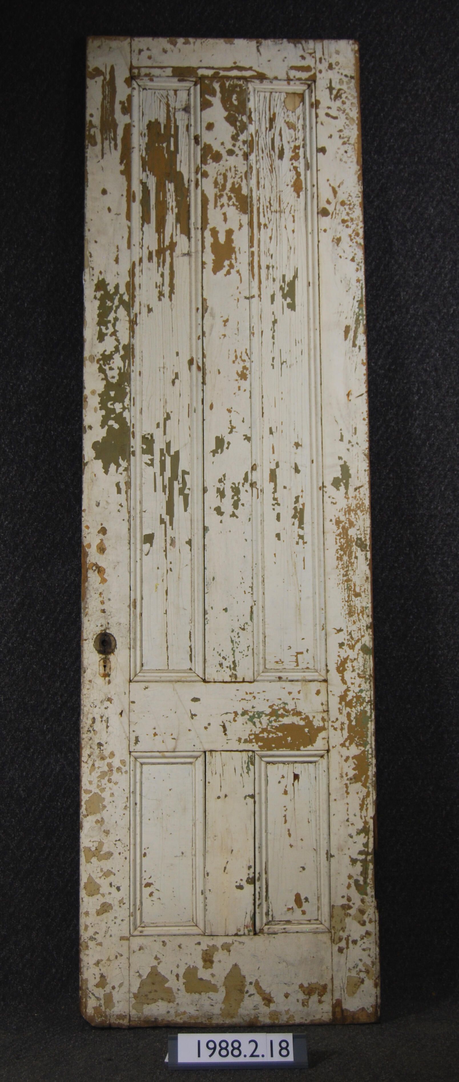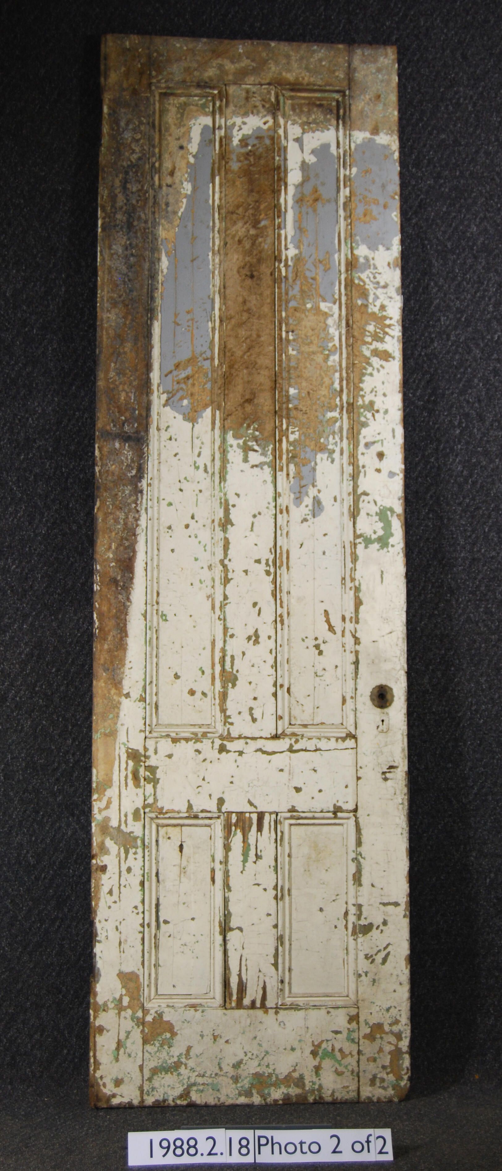 Exterior door. Four panels. Has mortice lock and two key hole escutcheons. All other hardware is missing. One side has severe damage abraded surface. Both sides painted cream (peeling).