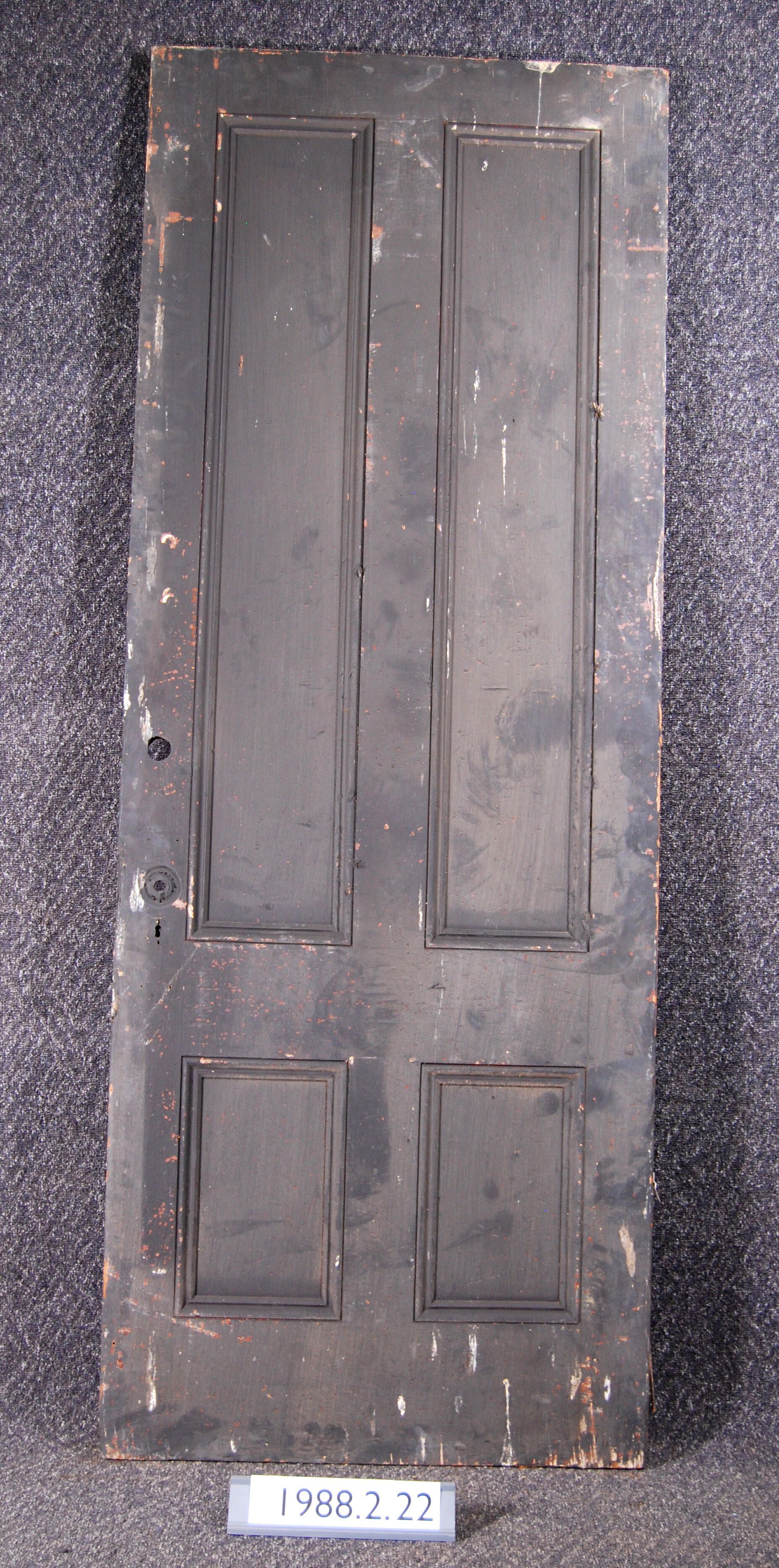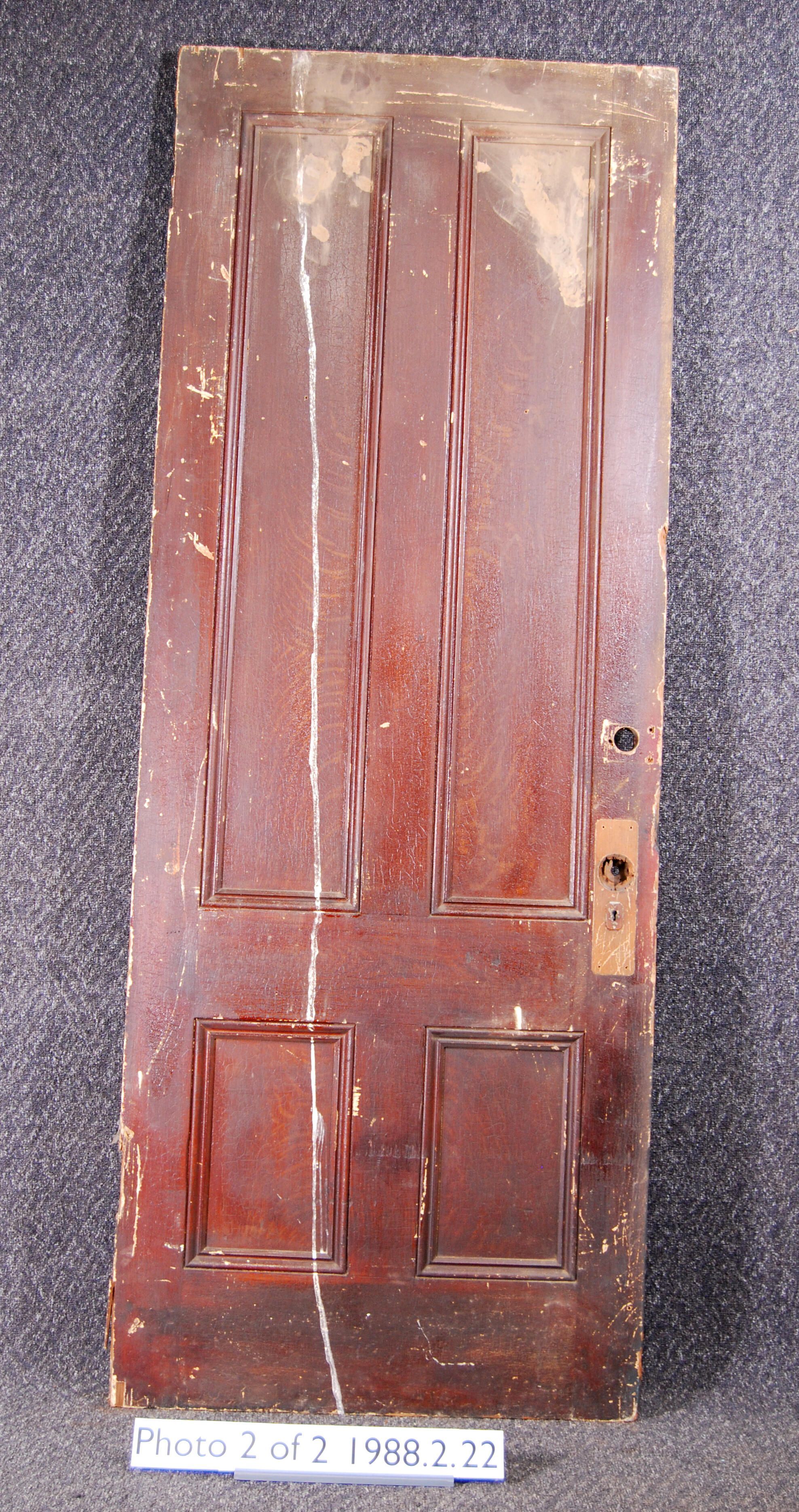 Interior / Exterior door. Four panels with applied moldings. All hardware is missing. Faux wood grained on one side - painted dark grey on other side.