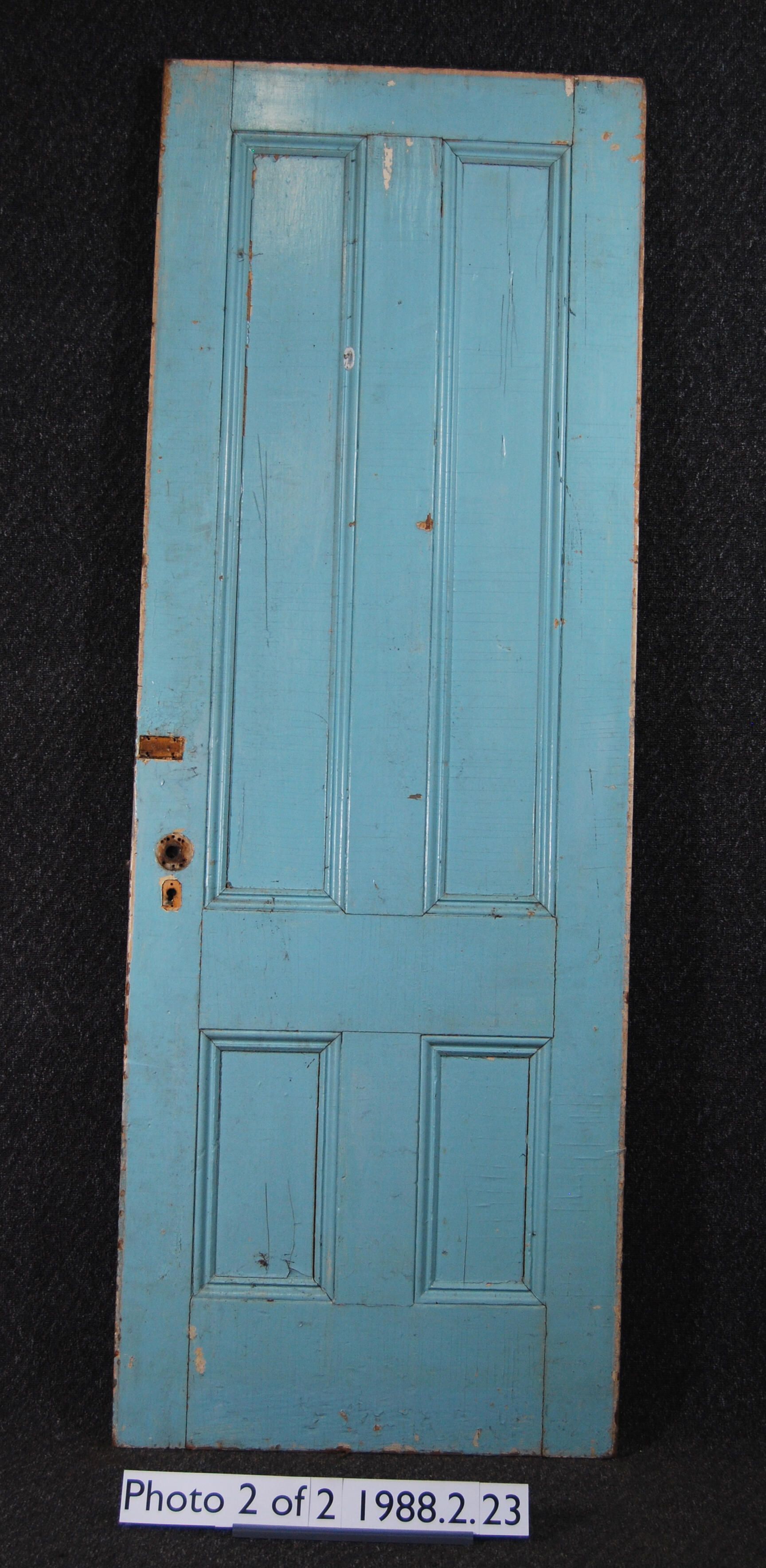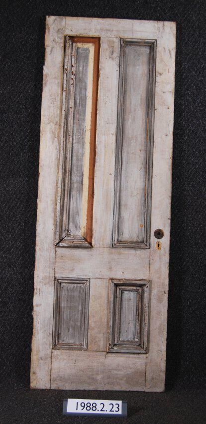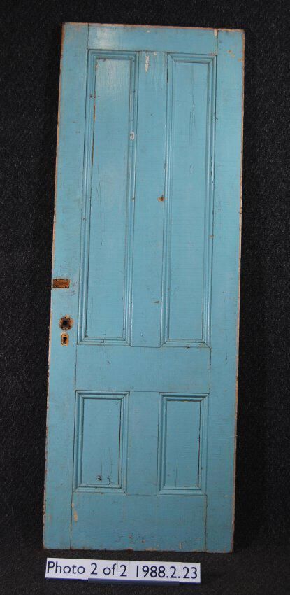 Interior / Exterior door. Four panels with applied moldings. Some moldings missing - others replaced. Has mortice lock. All other hardware is missing. One side is painted off-white - other side is painted greenish blue.