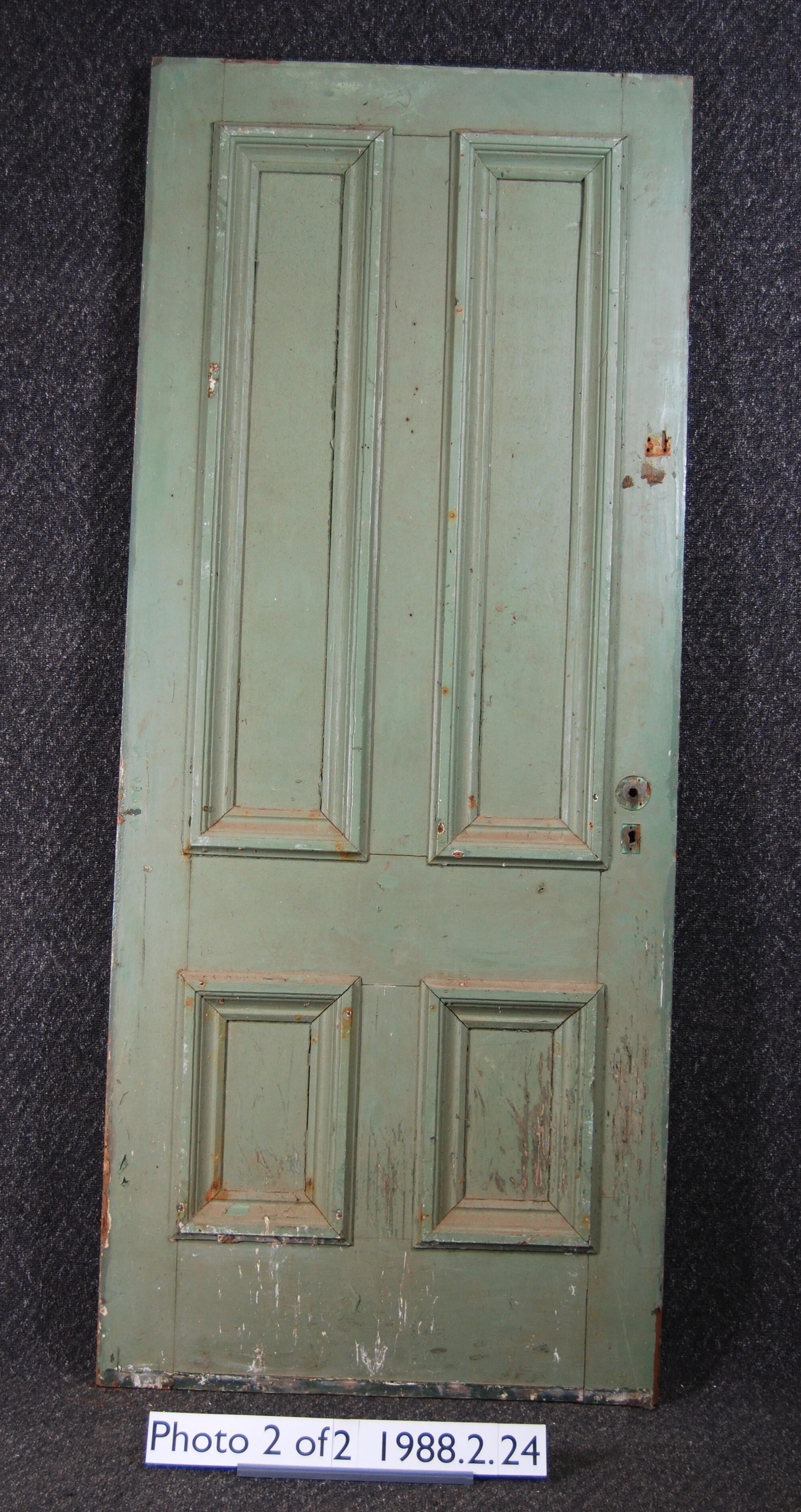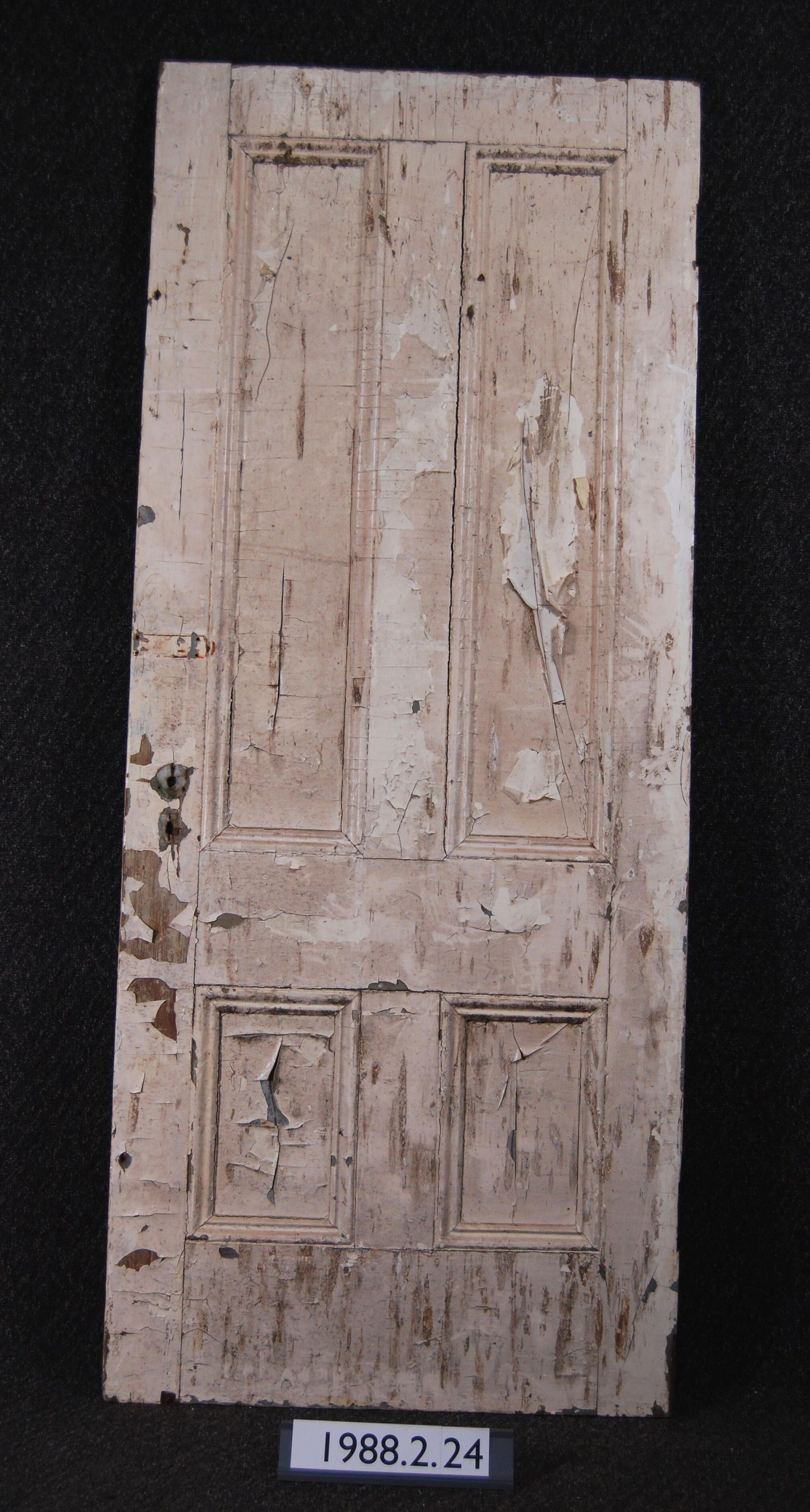 Exterior door. Four panels with applied moldings. Has mortice lock. All other hardware is missing. One side is painted green - other side is painted off-white.