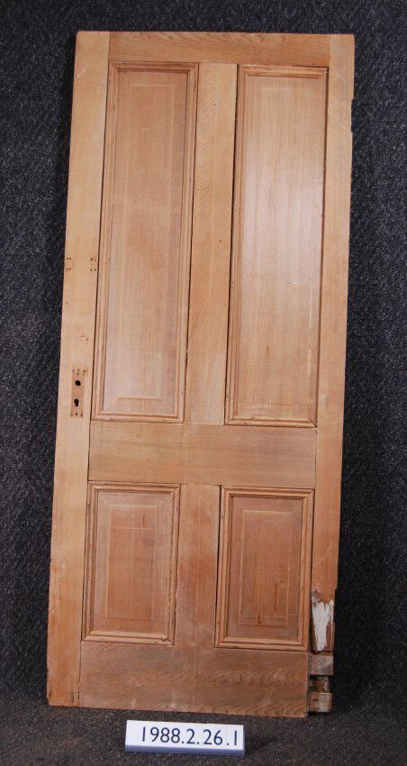 Interior door. Four panels with applied moldings. All hardware missing. Has piece missing from lower stile. Stripped of finish. Inscriptions or Markings: Manufacturer: Place of Manufacturer: Design Motif: Style: Finish: Stripped