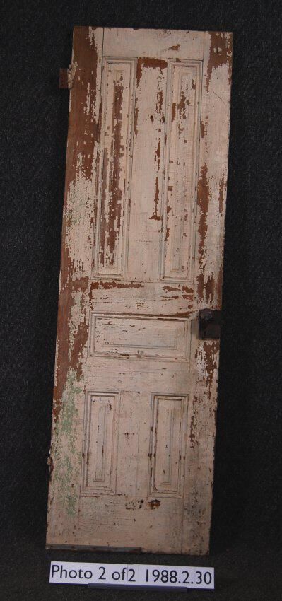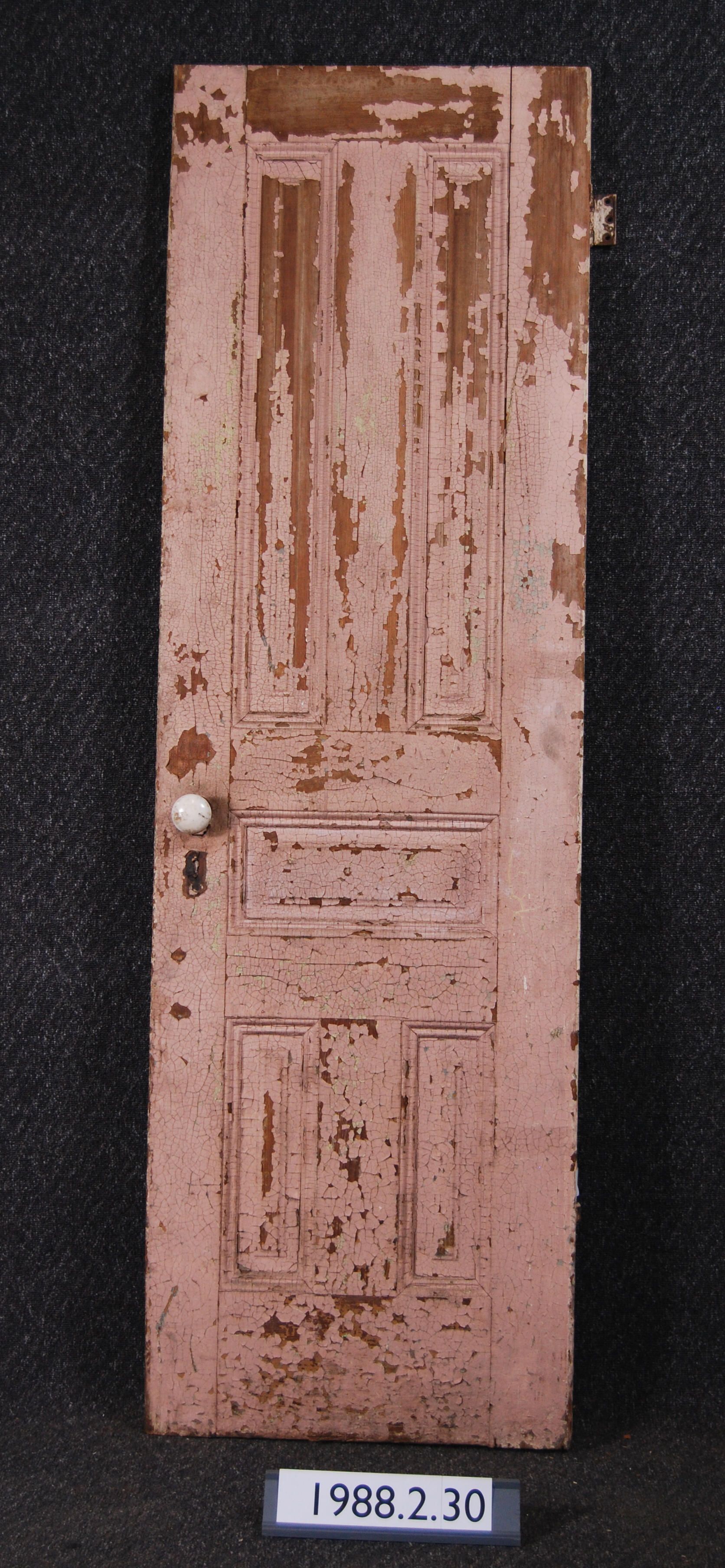 Interior door. Five panels with applied moldings. Has rim lock, iron knob, porcelain knob, cast iron hinge and hinge fragment. Painted pink on one side - painted off-white on other side (peeling).