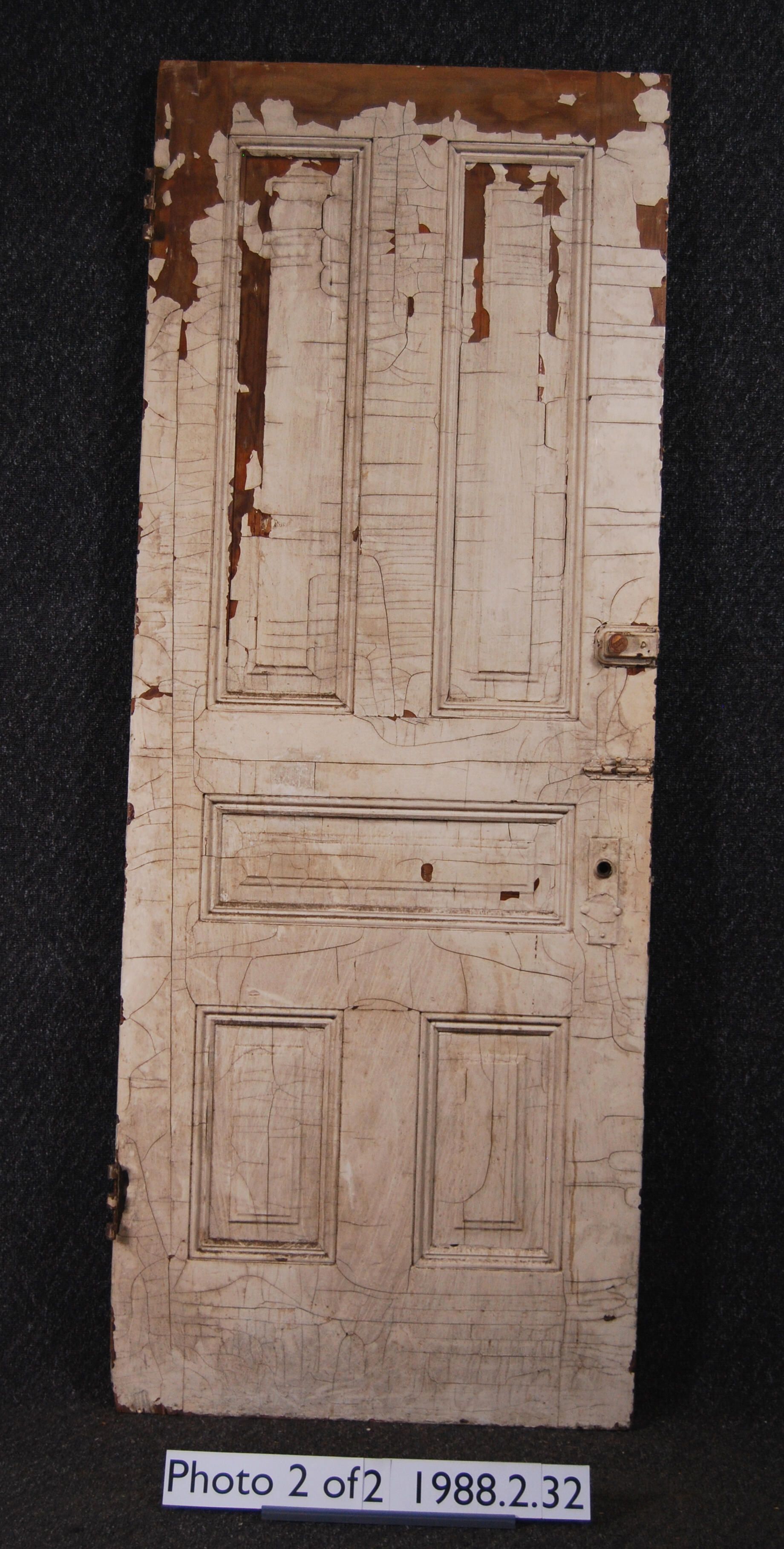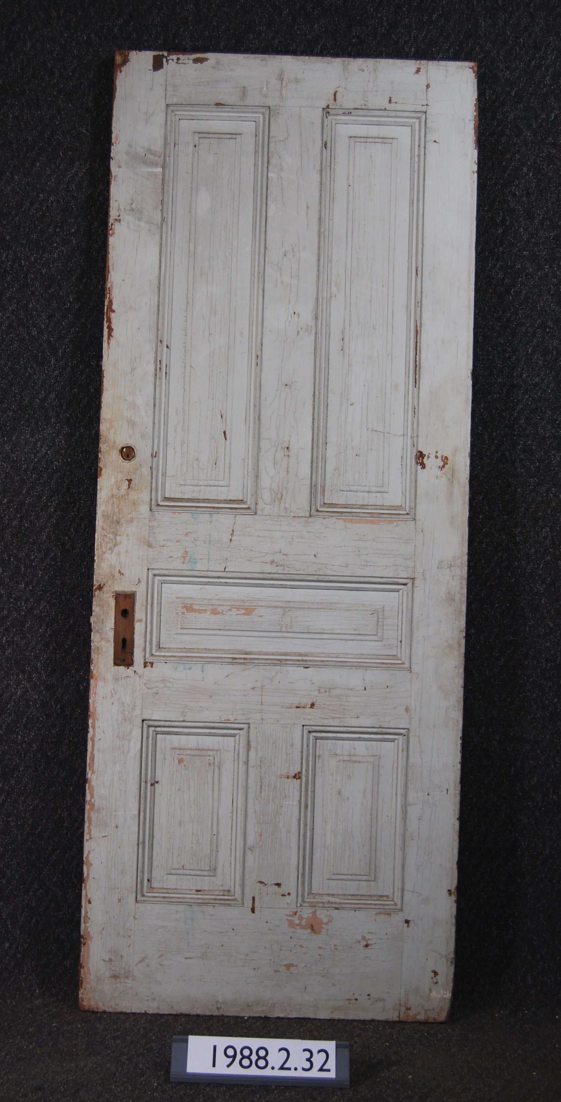 Interior door. Five panels with applied moldings. Has mortice lock. One escutcheon plate. Two hinge leaves. Later rim and cylinder lock (Yale). Painted bluish-green on one side - other side is painted yellow.
