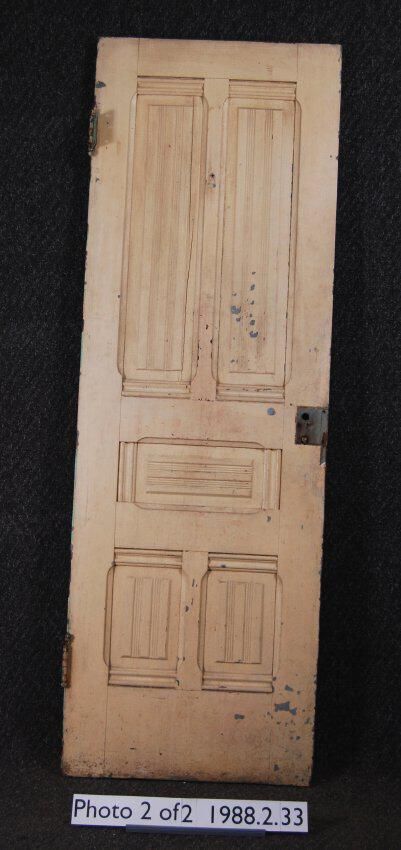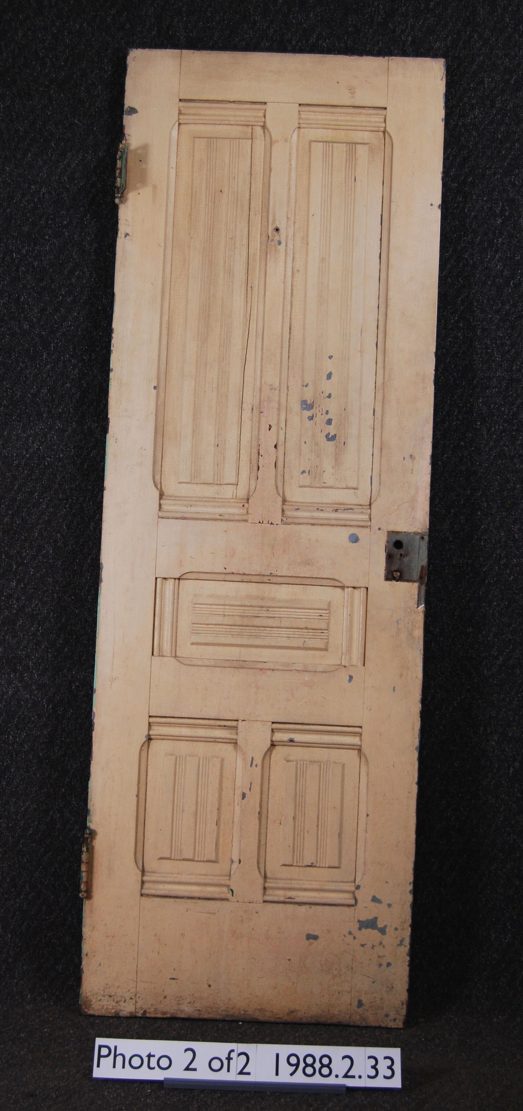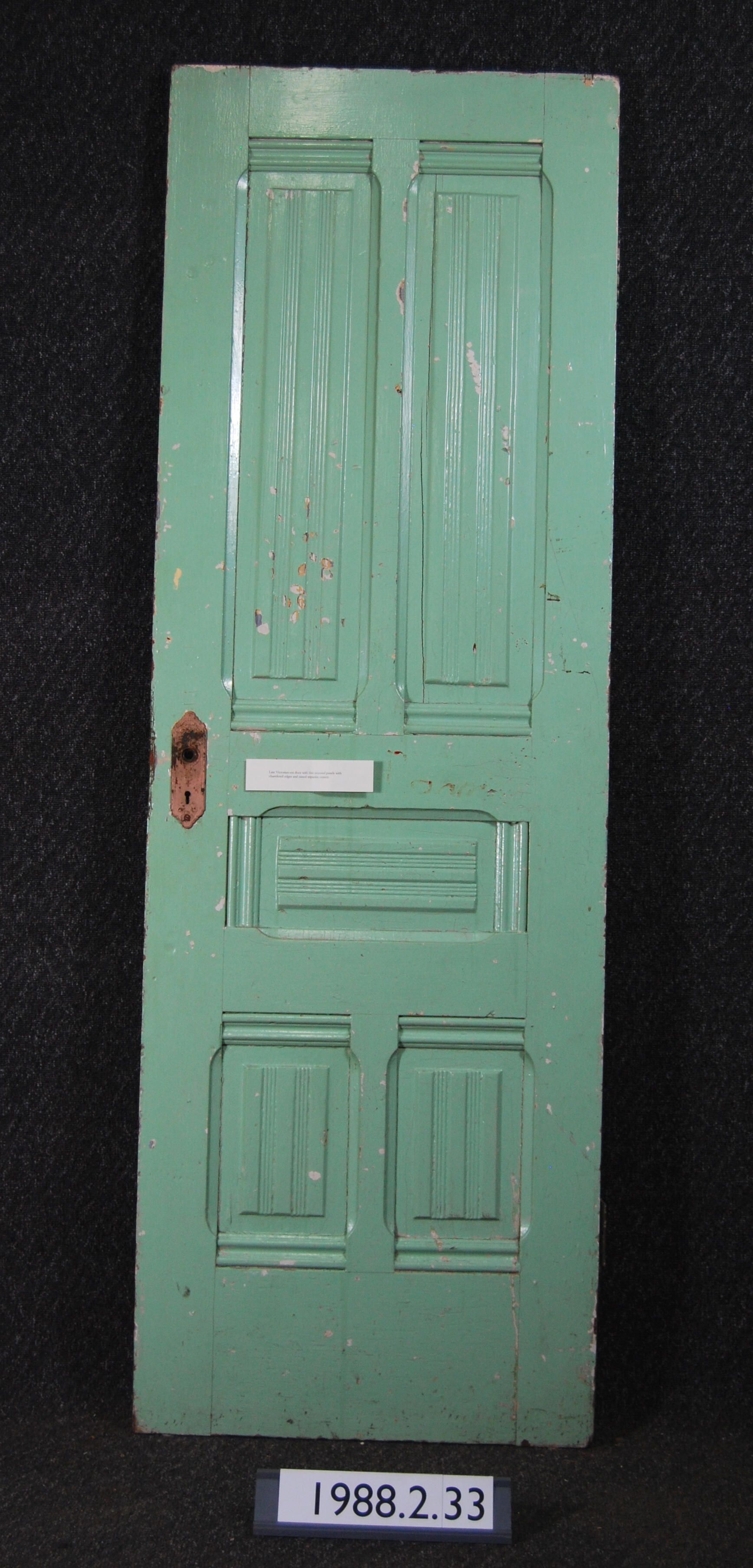 Interior door. Five panels with fluting and chamfered edges. Has two hinges and one escutcheon plate. Rim lock and knobs are missing. Painted green on one side - other side is painted yellow / tan.