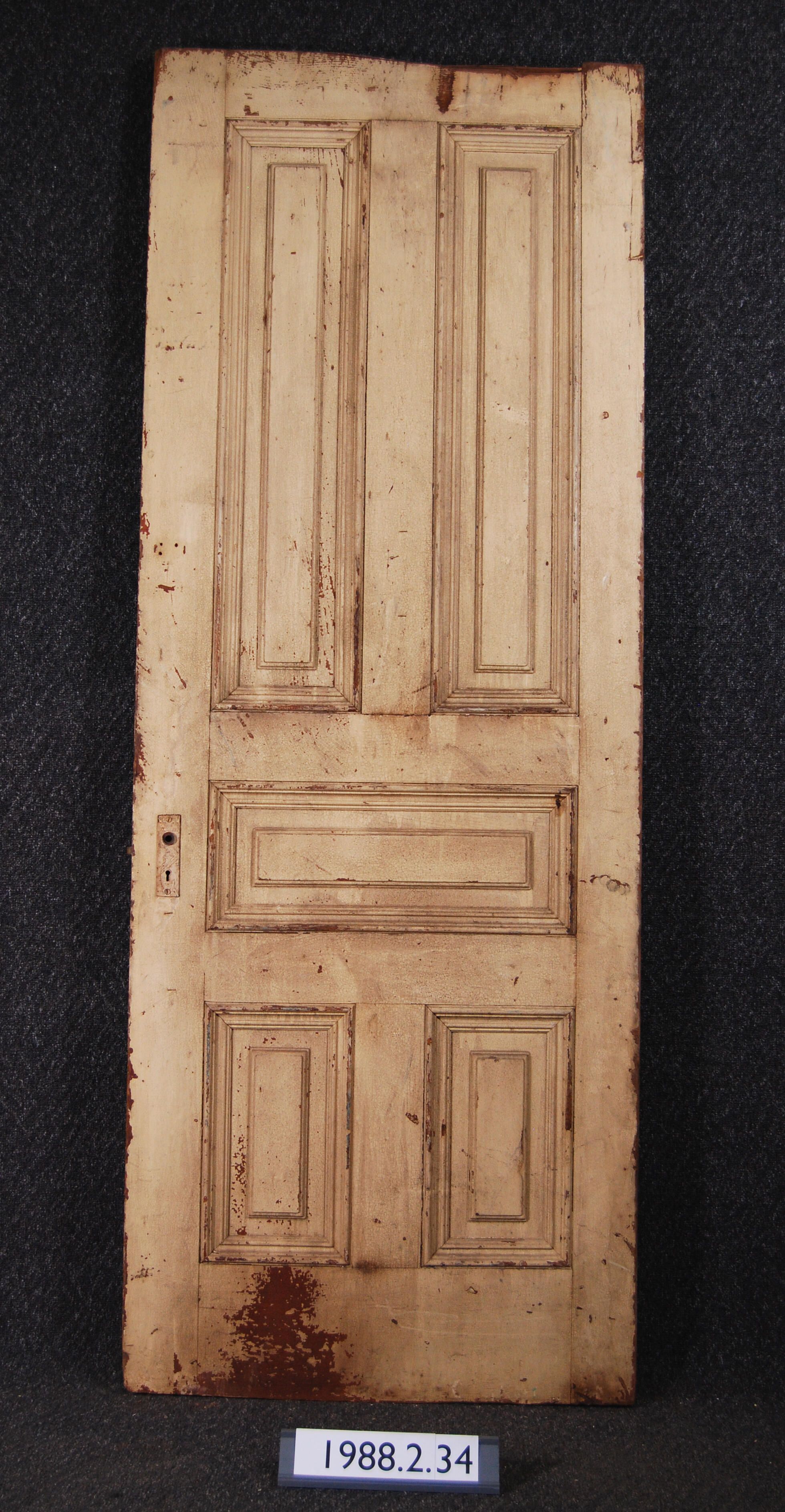 Interior / Exterior door. Five panels with applied moldings. Has mortice lock and escutcheon plates. Has three hinge leaves. Painted yellow / tan colored on both sides.