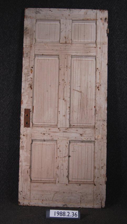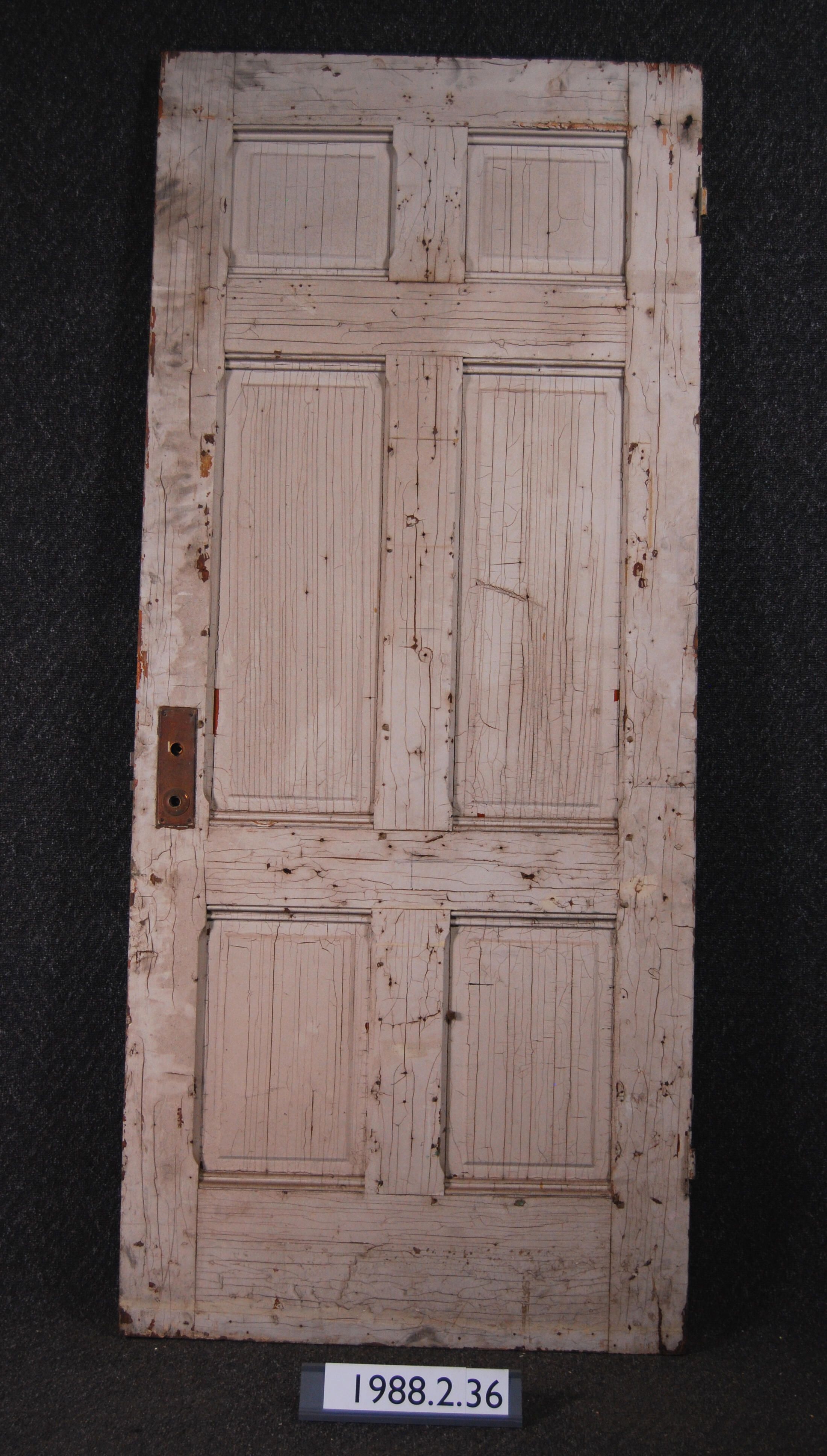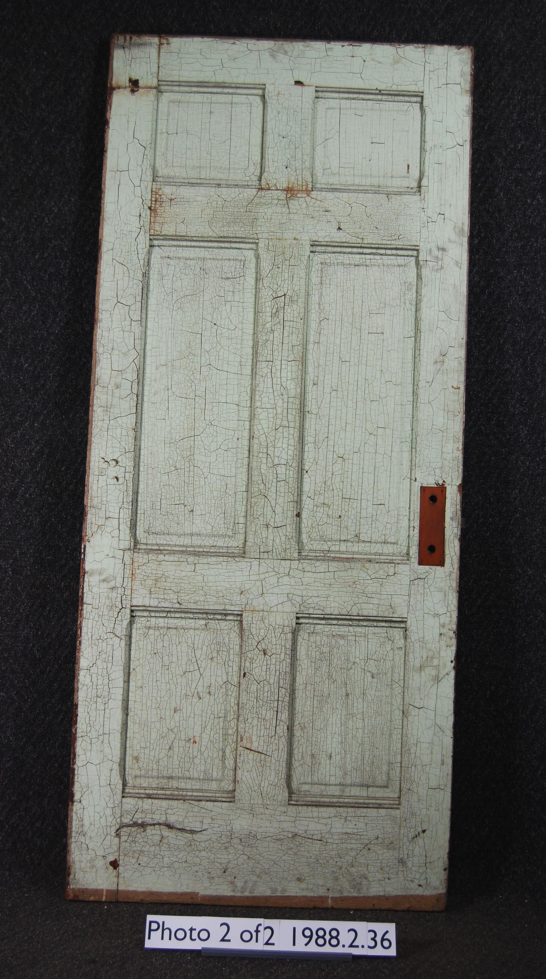 Exterior door. Six panels. Applied moldings and chamfered edges (Cross and Bible style panels). Has mortice lock and one escutcheon plate. Two hinge leaves. Painted beige colored on one side - other side is painted green.
