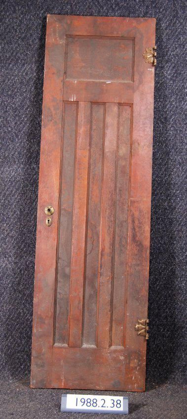 Closet(?) door. Four panels. Has two escutcheon plates and two keyhole escutcheons. Two hinge leaves. Varnished on both sides. Inscriptions or Markings: Manufacturer: Place of Manufacturer: Design Motif: Style: Finish: Varnished