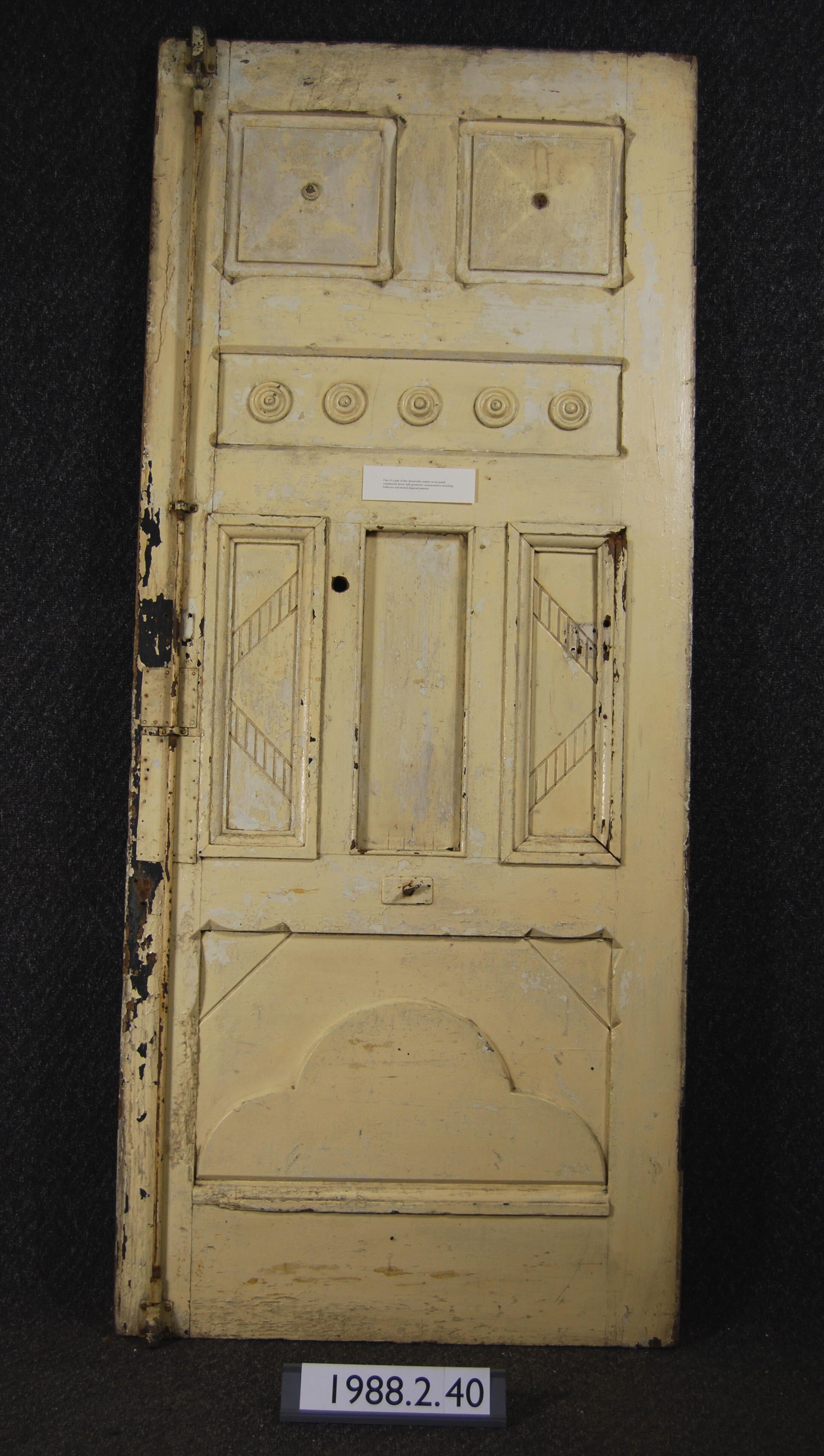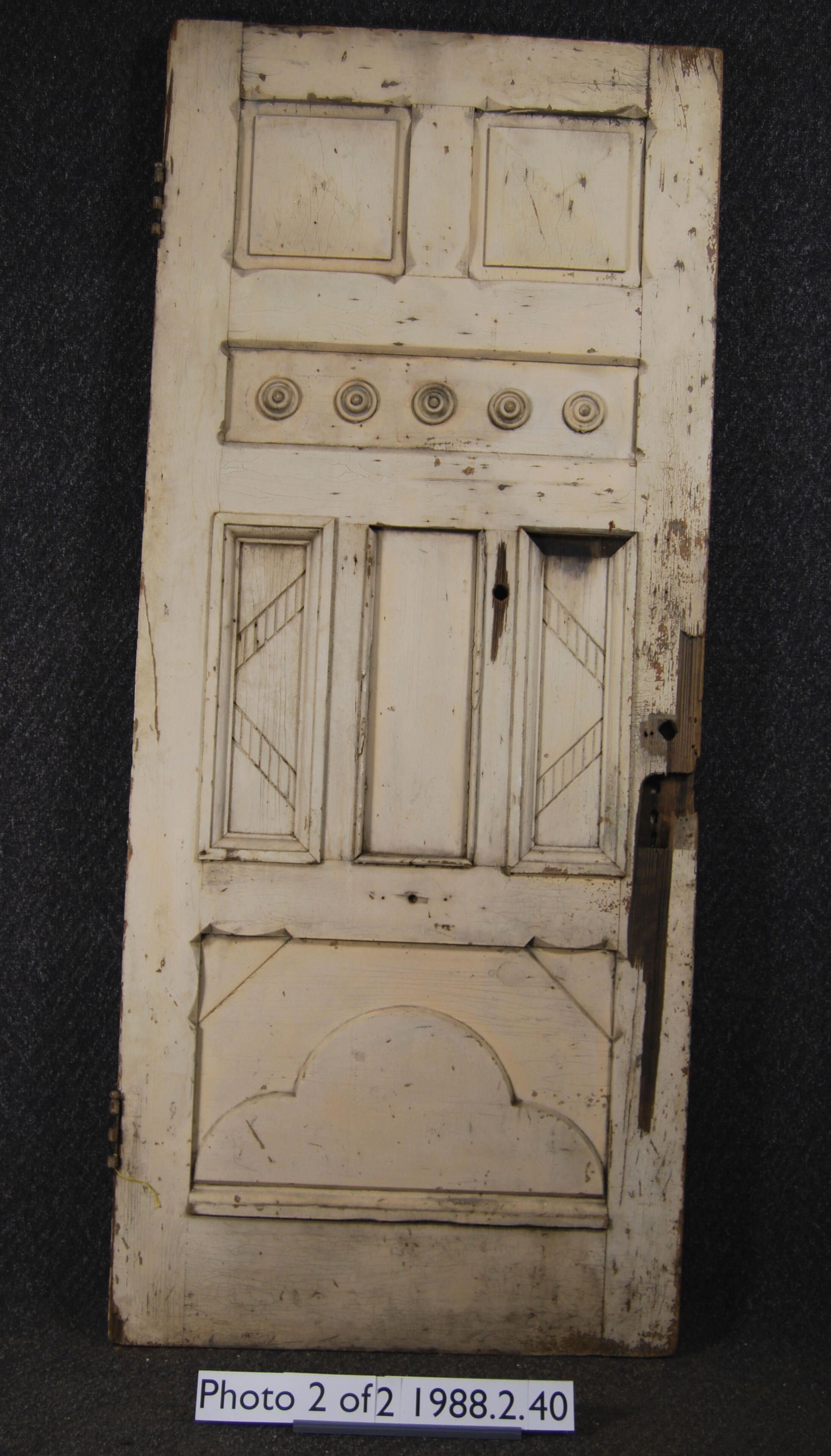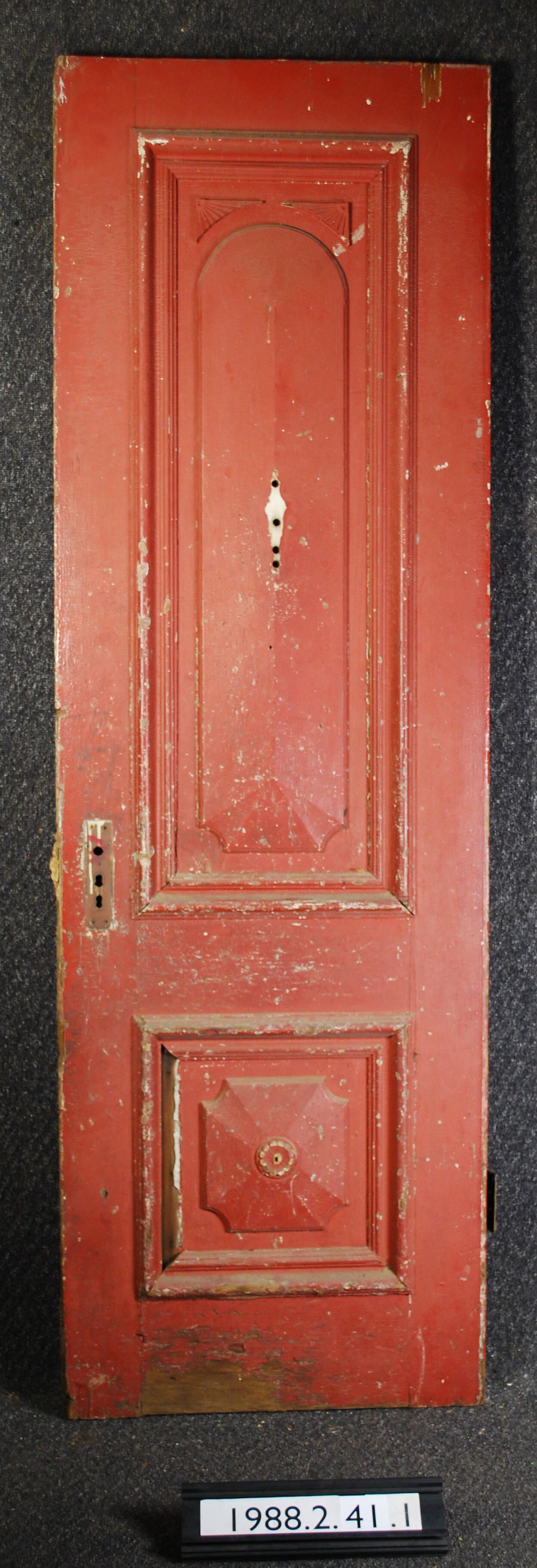 Exterior door. Two panels with applied moldings.Upper panel with sunburst / fan motif. Lower panel with rosette. Complete cast brass hinges - not original. Mortise lock and escutcheon plates missing. Painted red on one side - off-white on the other.
