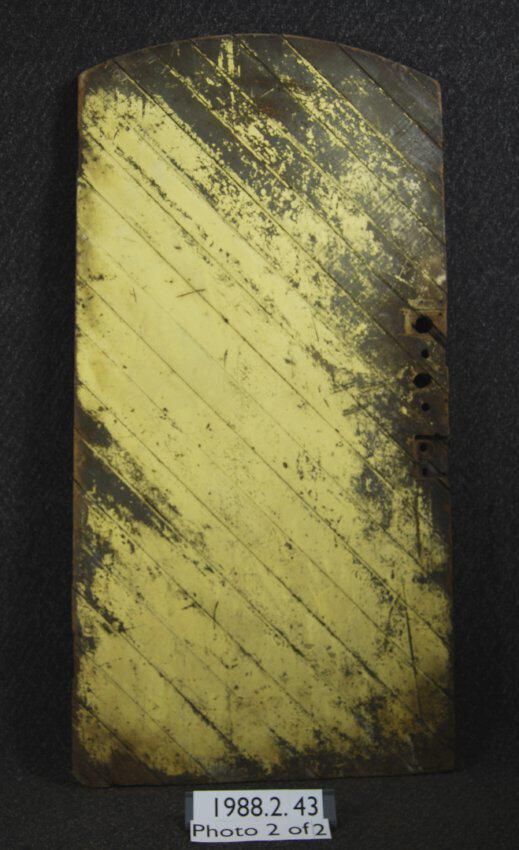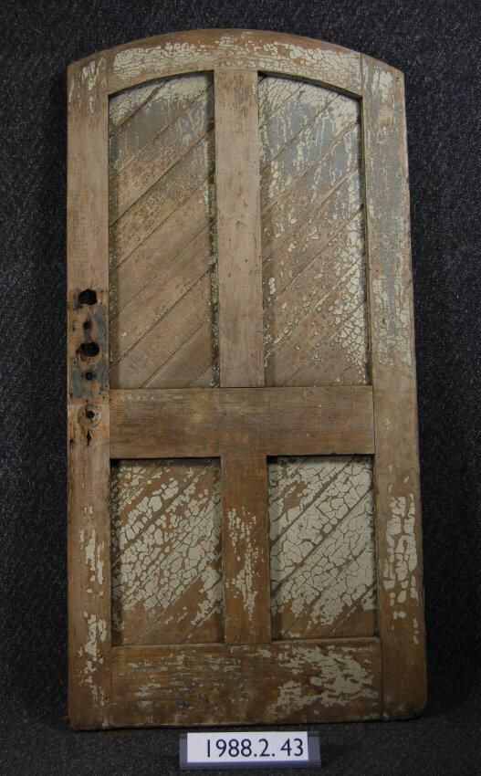 Exterior (cellar?) door. Arched top. Mortice and tenon construction. Cross-shaped frame has diagonal tongue and groove sheathing with bead on edges. All hardware is missing. Exterior has peeling grey / tan paint - interior side painted yellow.