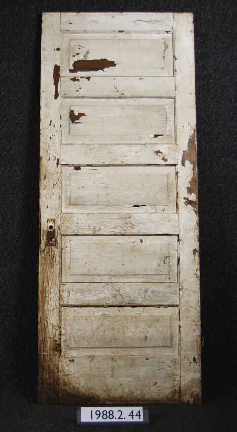Interior / Exterior door. Five panel. Mortice lock is missing. Has two plain iron escutcheon plates and two hinge leaves. Peeling white paint on one side - yellow paint on other side.